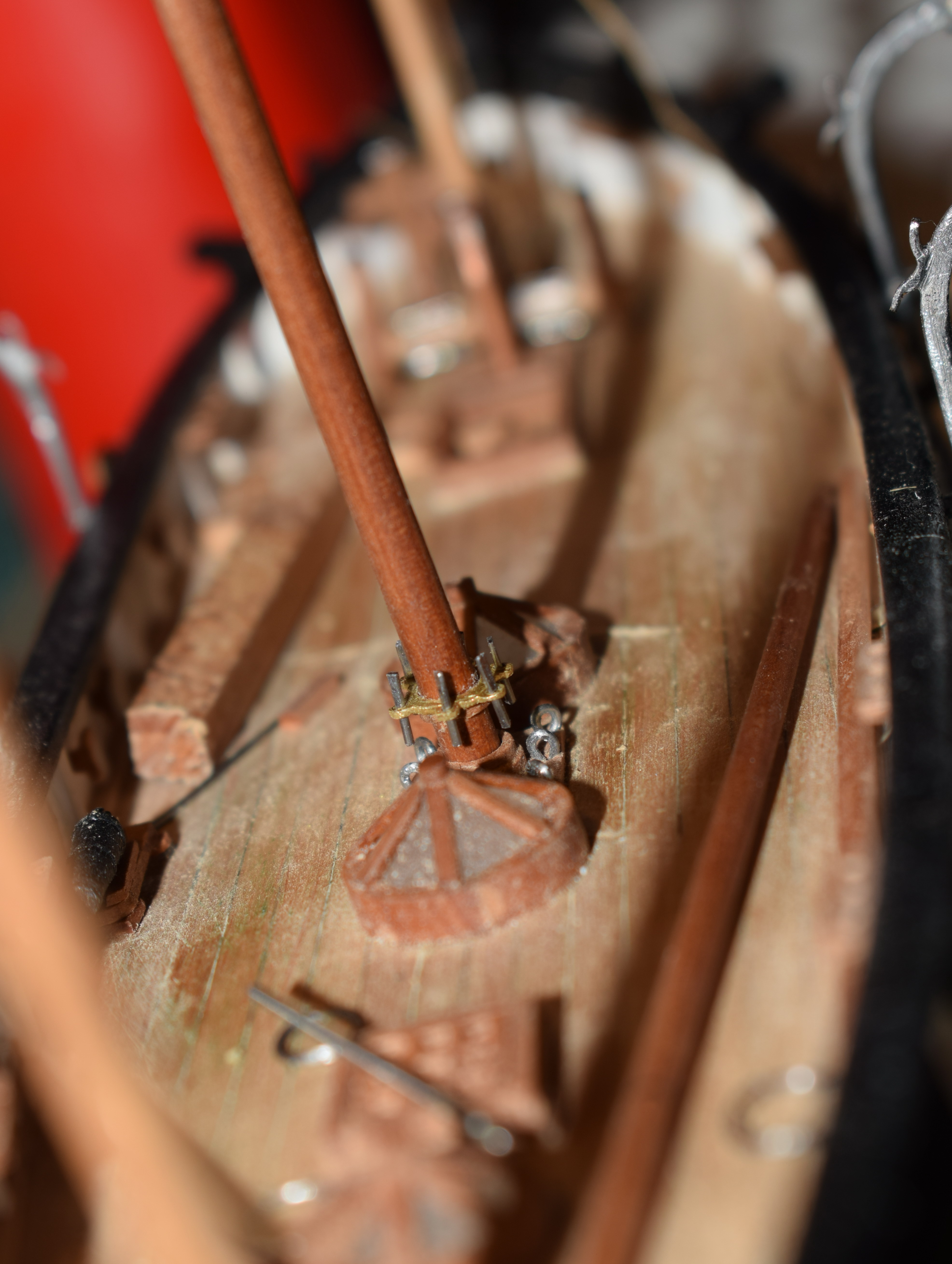 При таком варианте можно сделать "ход конем" - разделить мачту на 2 детали , сделать вставку из латунного прутка , соединить эти 3 детали на 1 штифте . После чего уже эту латунную вставку сверлить на 5 дырок не боясь развалить мачту.