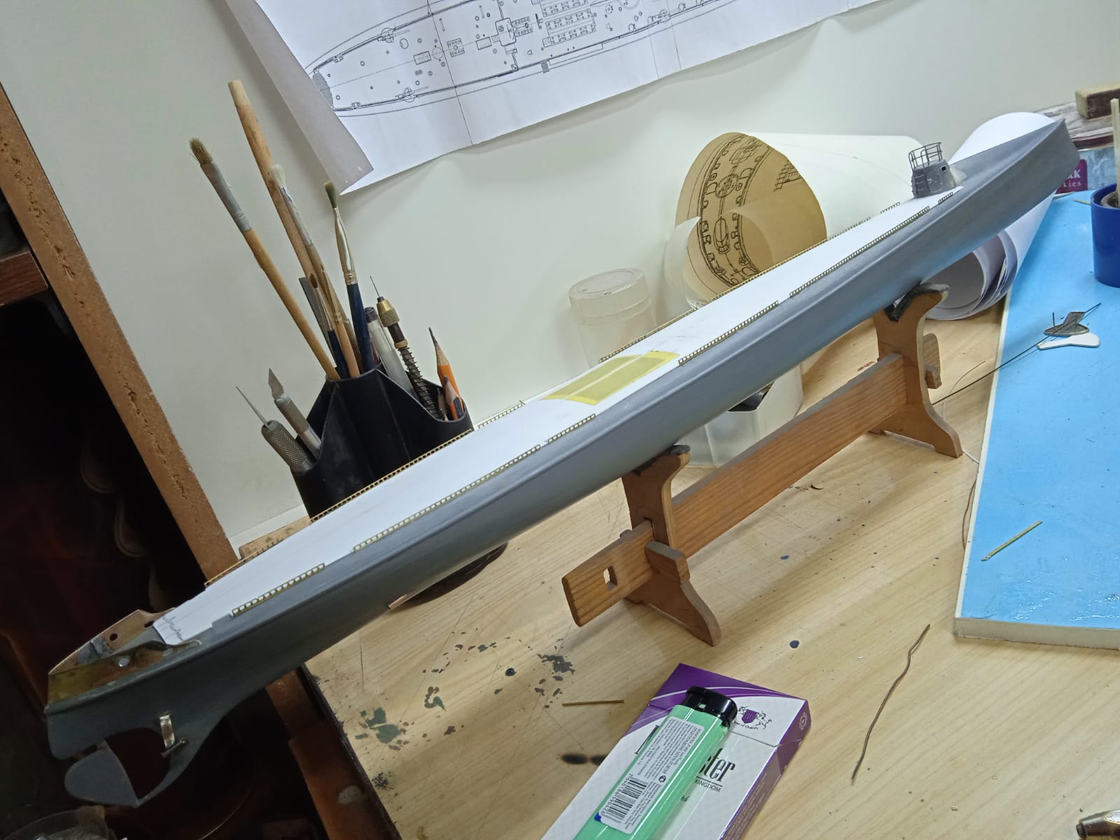 Парни, привет! В общем, строю для музея РЯВ модель миноносца "Лейтенант Бураков" в масштабе 1:100. Отдельную ветку заводить не хочу, буду иногда тут освещать процесс, к тому же товарищи попросили показывать постройку на "Каропке". На сегодняшний день, не считая отдельно лежащих (изготовленных) в контейнере деталей, будущая модель выглядит так.