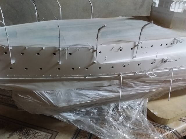 Вячеслав, на самом деле ничего сложного. Леерные ограждения, как над боевой рубкой, так и на крыльях мостика крашеные. Изначально красил отдельно стойки (можно хотя бы их основания), Затем вклеивал стойки в просверленные посадочные места. Заклеивал прилегающую поверхность малярным скотчем. Протягивал через стойки латунную проволоку толщиной 0,3 мм и пропаивал. Остаются только всё подкрасить кисточкой.