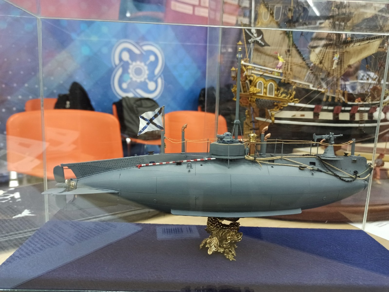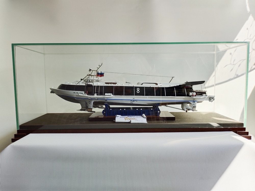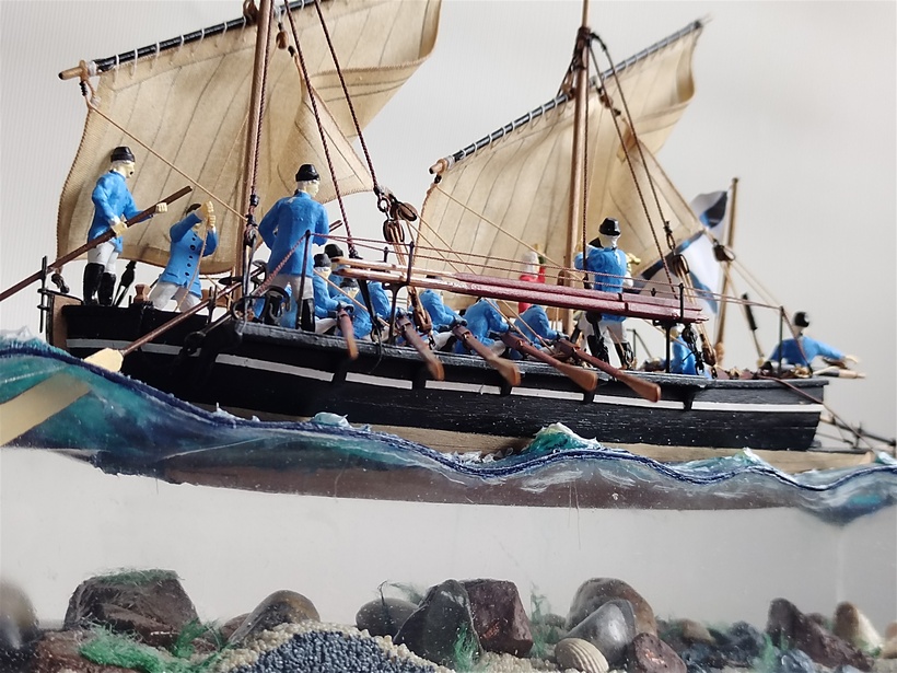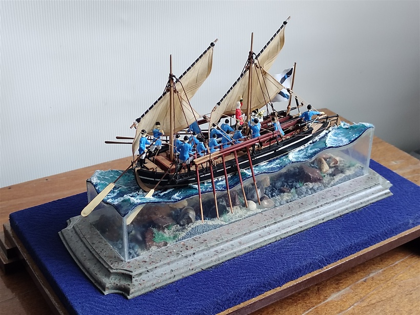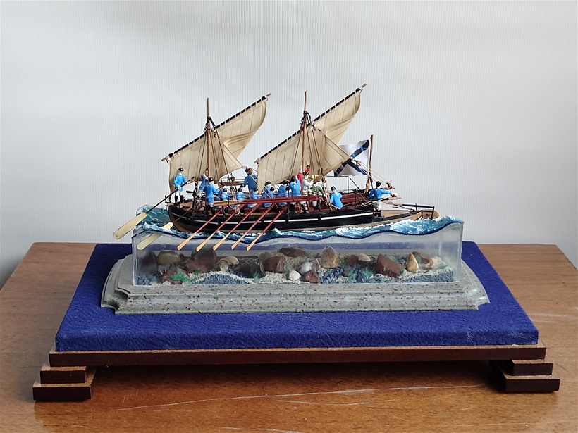 Модель йола вставлена в выборку своеобразной водной стихии, сделанной в виде параллелепипеда - четырехугольная призма без дна из оргстекла или акрила. Лучше брать оргстекло 1 - 1,2 мм, больше возможности решения проблем с царапинами. Верхняя плоскость параллелепипеда, представляет поверхность моря с волнами. Изготовлена методом нагрева и копирования по болвану. Волны, окрашены акриловыми красками и покрыты силиконовым герметиком, слоями. Это придает хорошую имитацию водной поверхности в глубину.