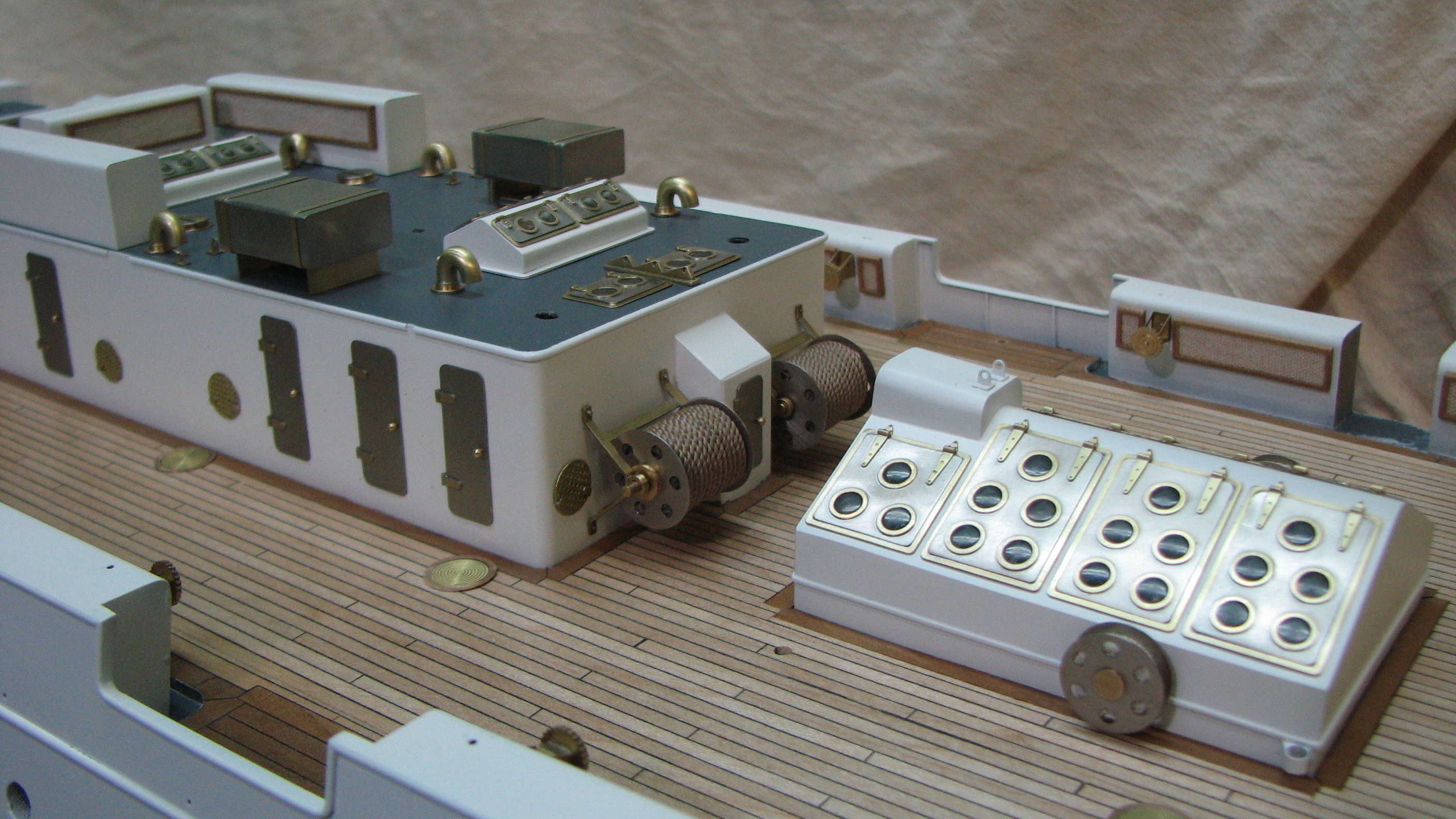 На котельном кожухе носовой трубы их 6 , но меньшего диаметра. На исторической модели и на фото в США крышки горловин закрыты, но на одном снимке , на бортовой коечной сетке, в походном положении , закреплен вентраструб малого размера . Вероятно это как раз он и ставился на горловину на крышке котельного кожуха ближайшей трубы.
