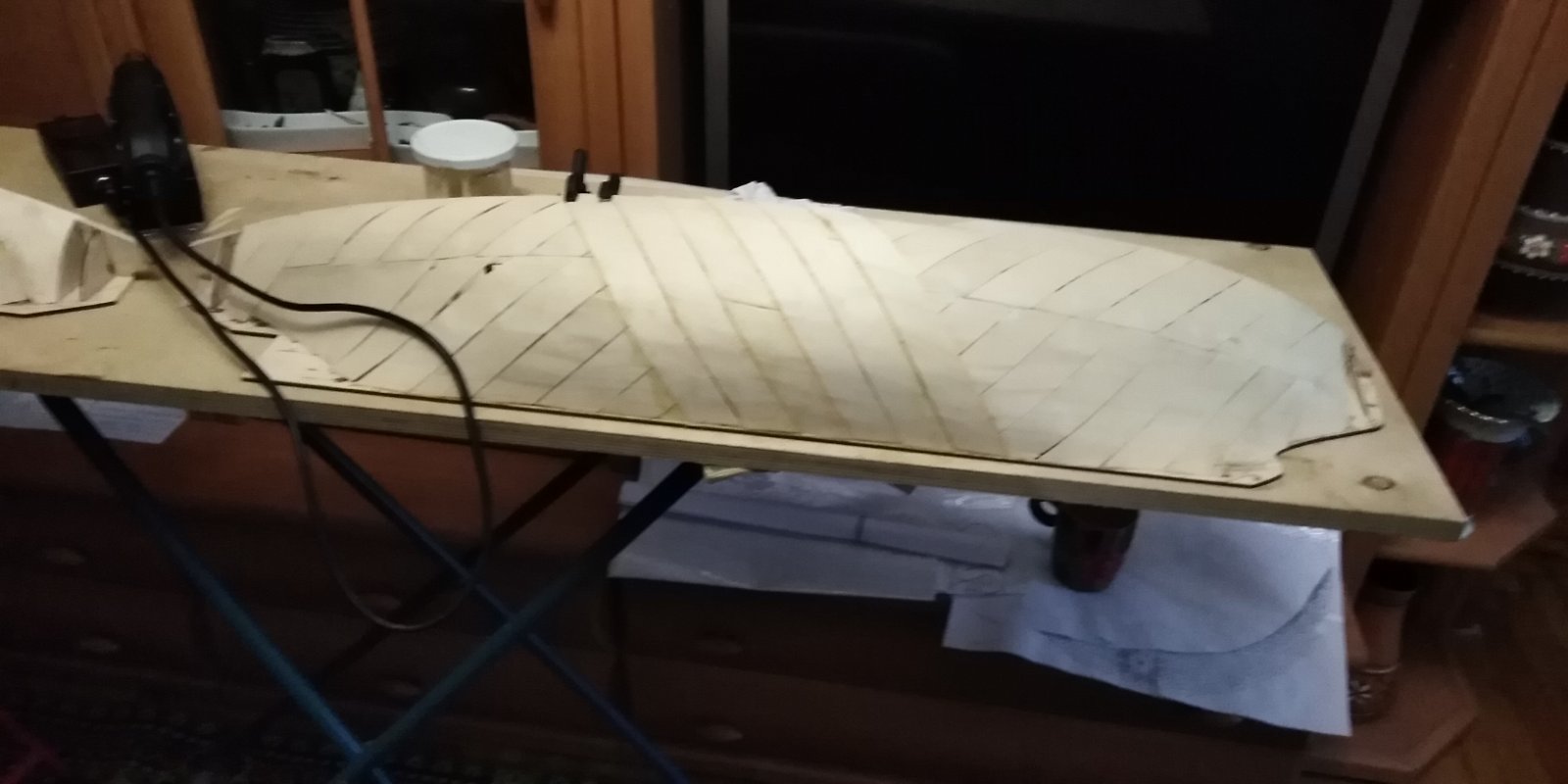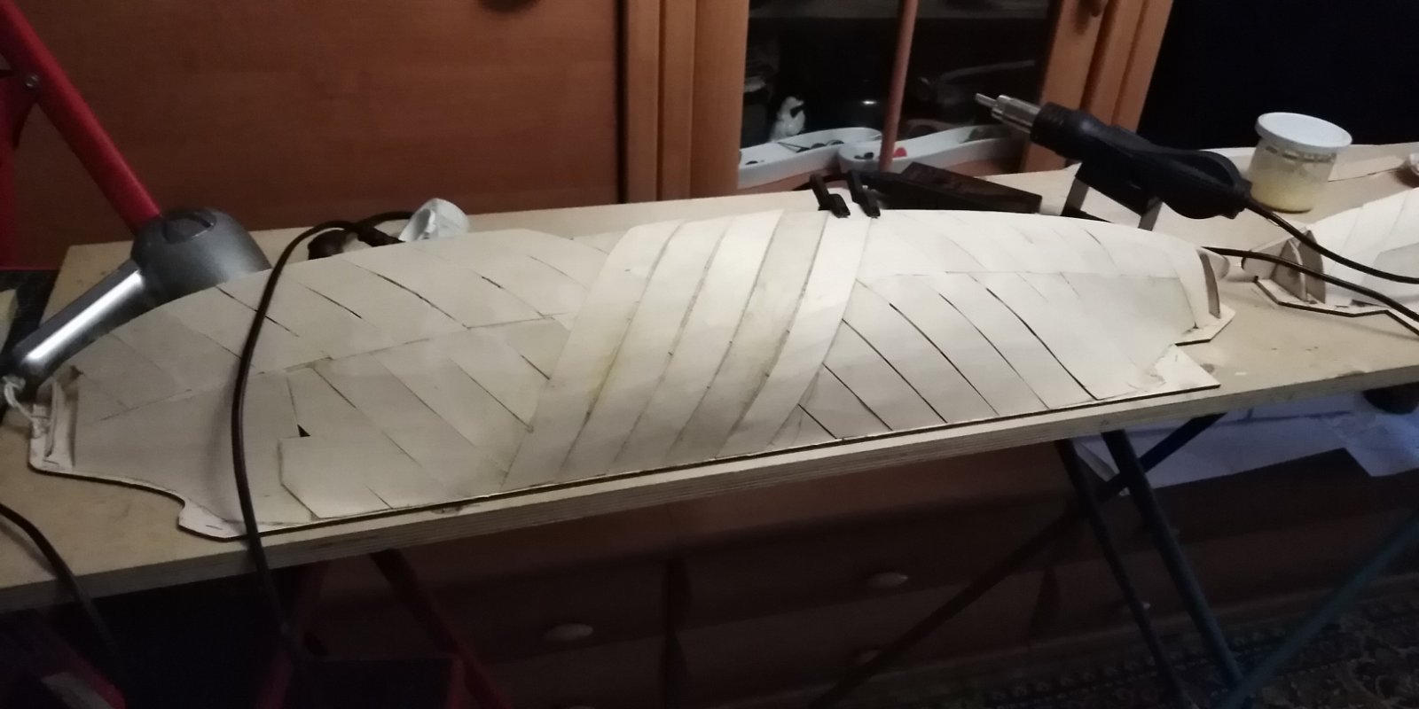 Вместо деревянной рейки применена диагональная обшивка из кленового шпона толщиной 0,8 мм , яйцеобразные обводы корпуса позволили это сделать.