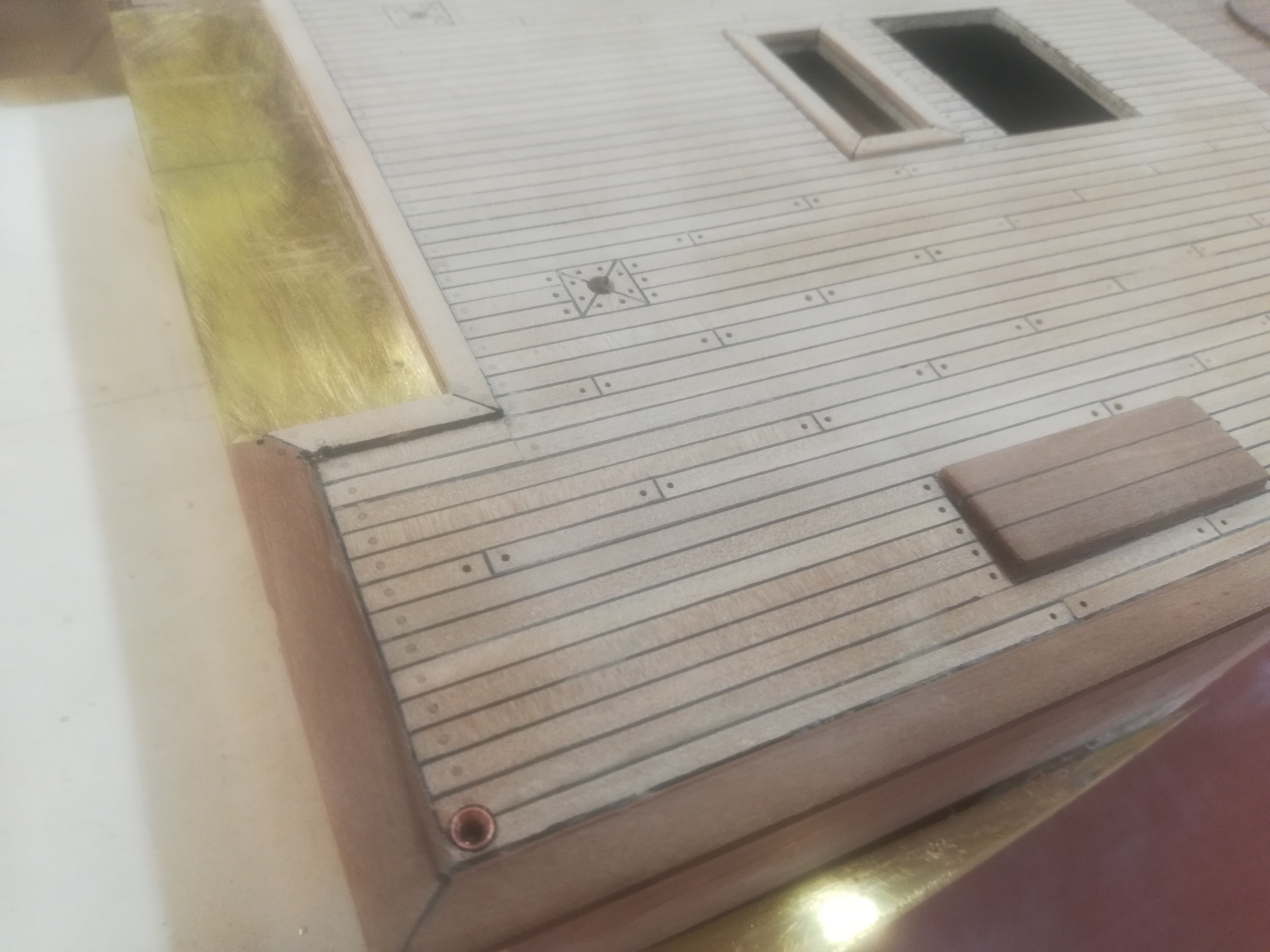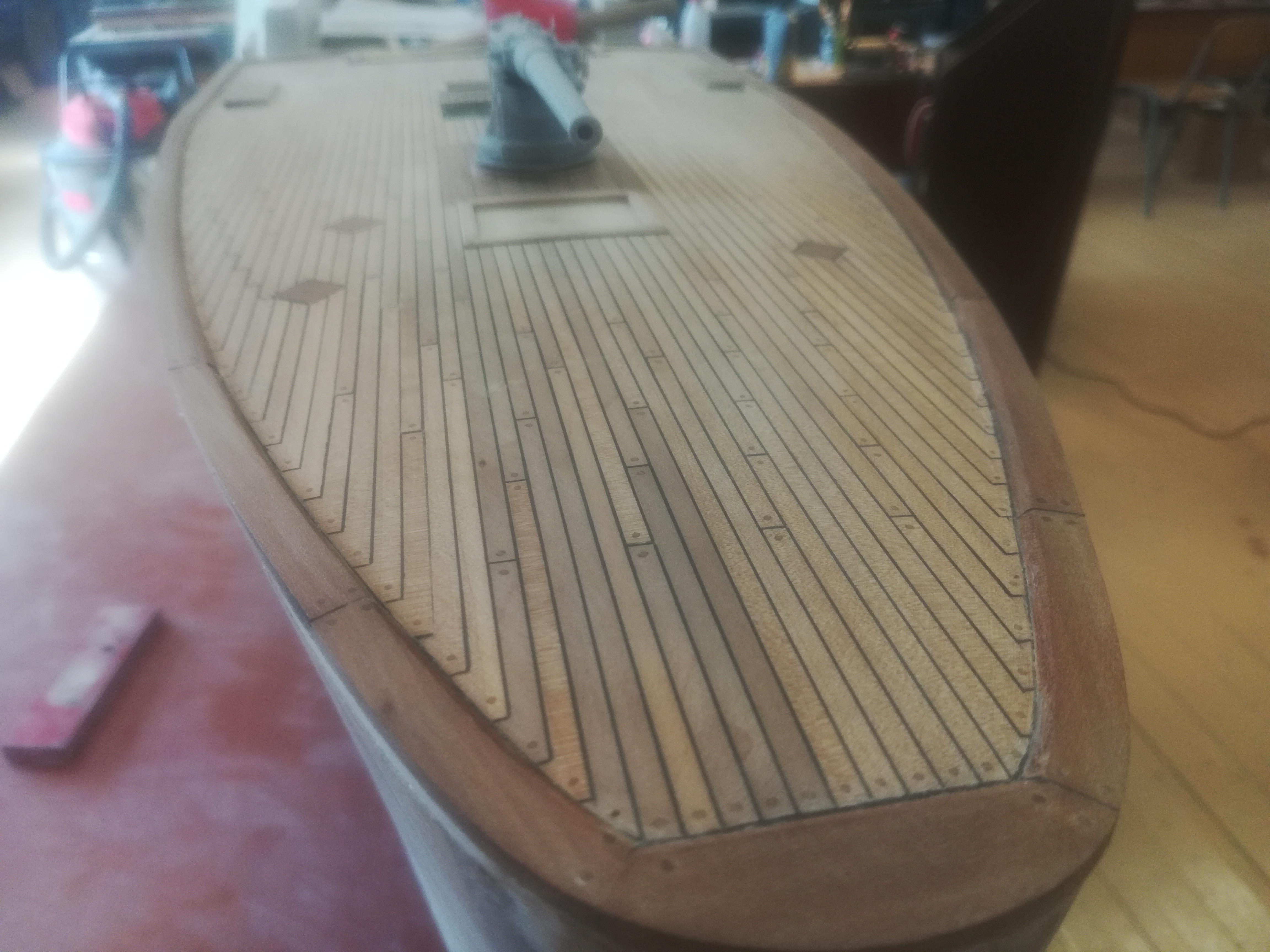 Вот, что имеем на сегодняшний день: Пробки палубных досок ещё не все, нет больших шпигатов перед подушками кнехтов, и по мелочи, ещё не всё окончательно зашкурено, ватервейс внутри надо выводить под одинаковым углом...позже обнесу его полосой и после покраски корпуса приспособлю полукруглый брус с внешней стороны полосы.