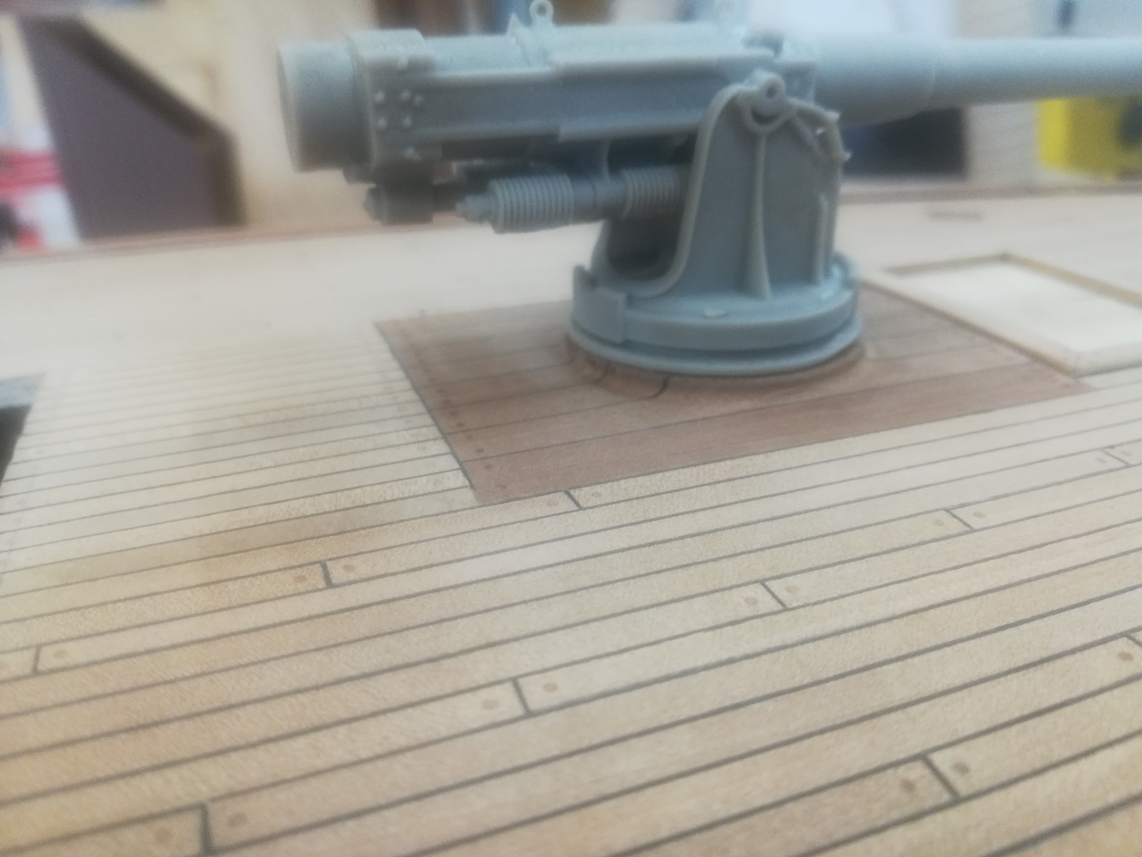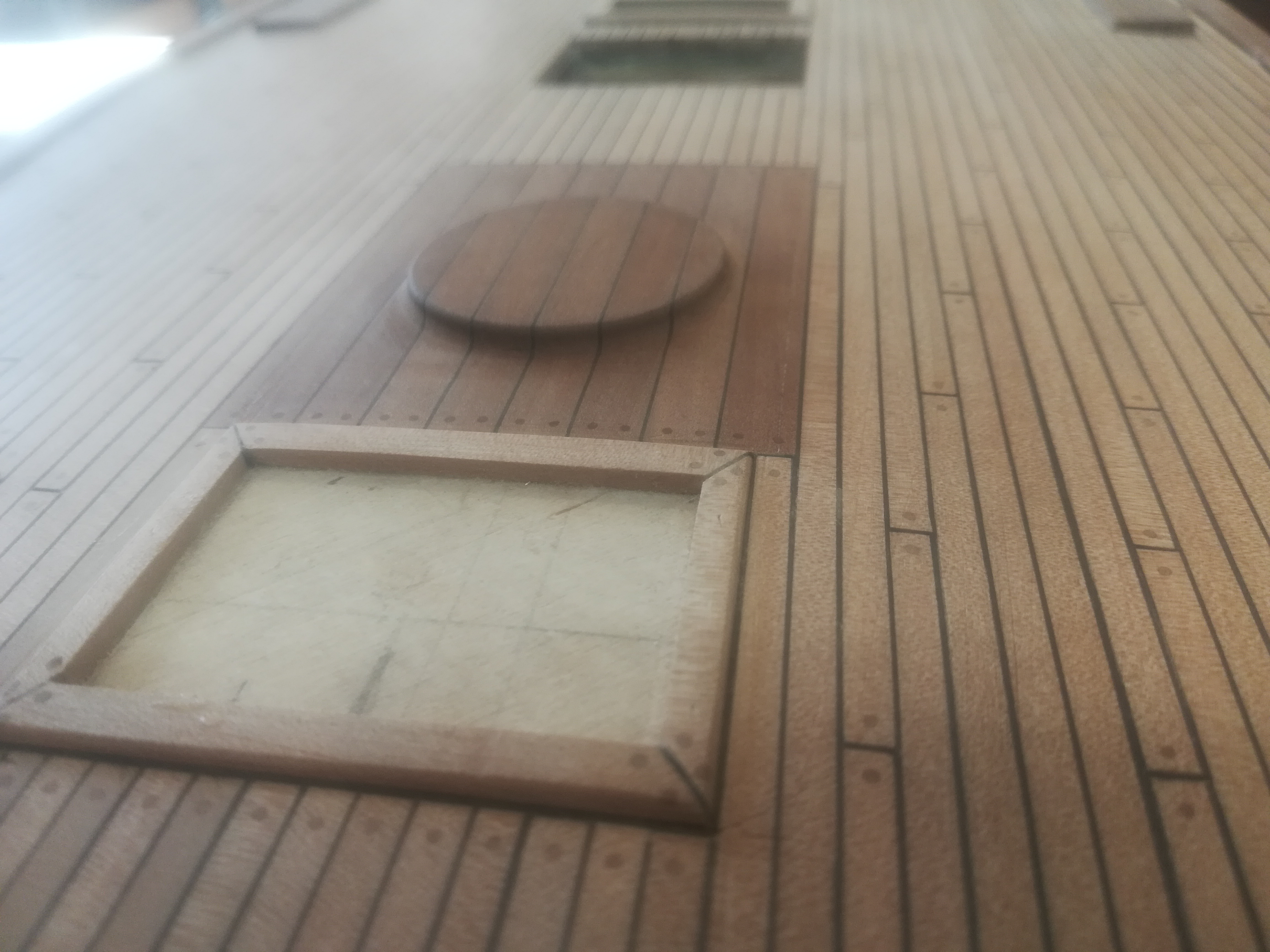 Виталий, я согласен, что должно быть по две. Тут сыграл ещё фактор восприятия. Правильный размер пробки в этом масштабе где-то 0,4-0,5 мм, тогда две пробки нормально помещаются на торец, но воспринимаются они, особенно там, где торцы досок упираются в обносы люков, сплошной тонкой линией, даже не понять, что это ряд пробок. Я делал пробку 0,8 мм исходя из "смотрибельности", а тогда две пробки на торце занимают половину ширины доски...как то не очень... Согрешил, каюсь