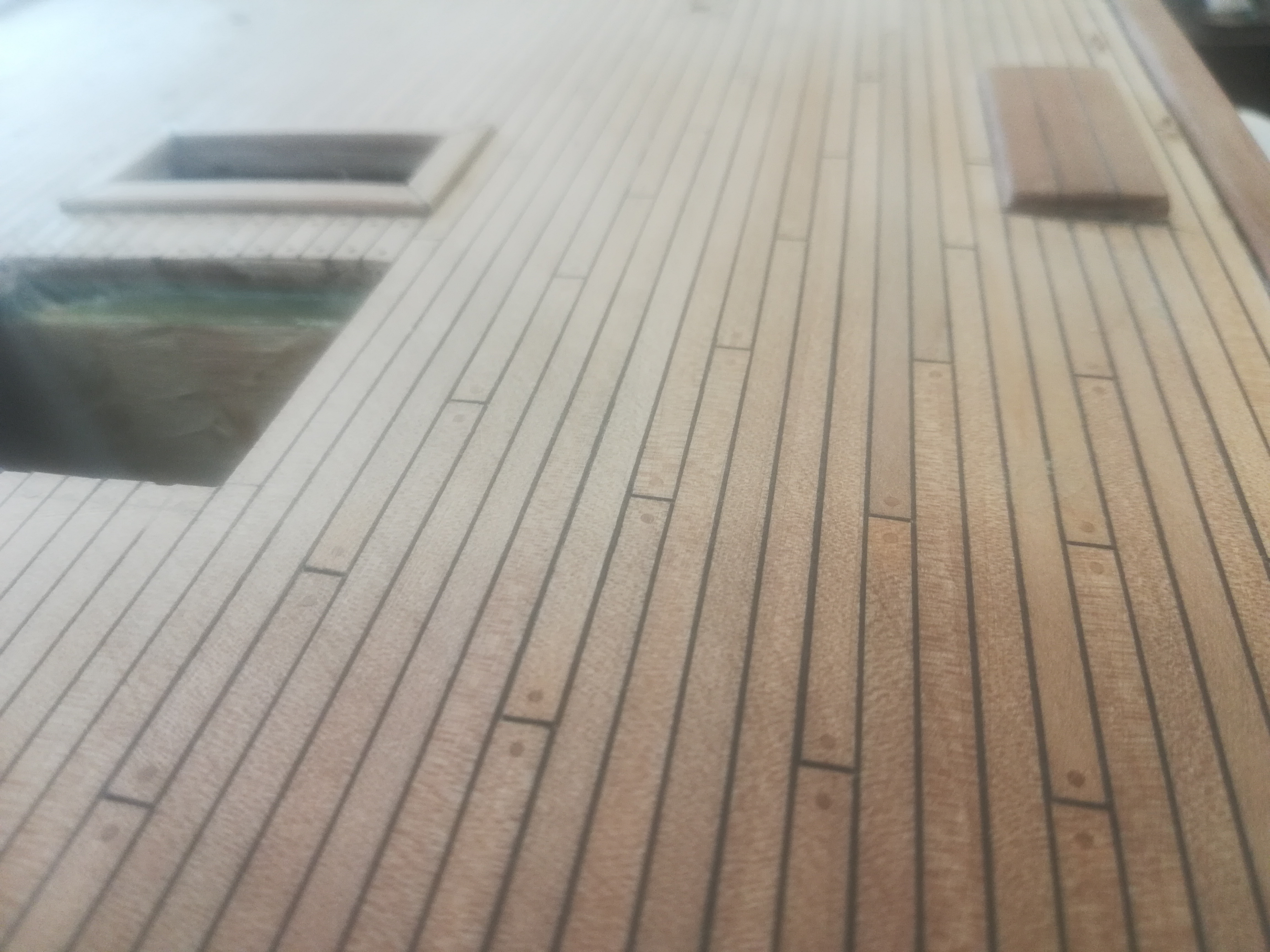 Первый, который напилил с укладкой от бортов к центру, пришлось выкинуть полностью.Как не расчитывал ширину досок с наклеенной бумажкой, а к ДП всё равно или получалась щель, или доска бОльшей, ширины, чем остальные. Второй вариант был от ДП к ватервейсам, тоже, вроде, всё шло нормально пока не дошло до досок с "клювами", на одном борту "клювы" получились совсем маленькие, почти не заметные, на другом - в два раза шире самой доски