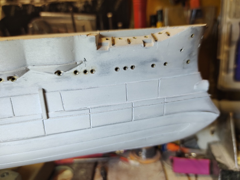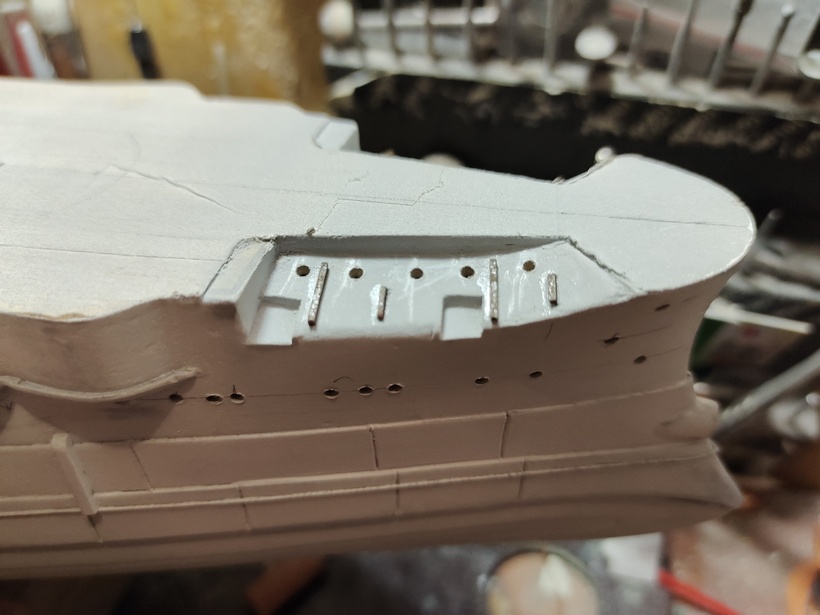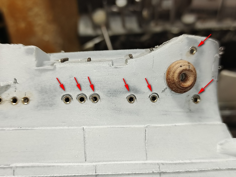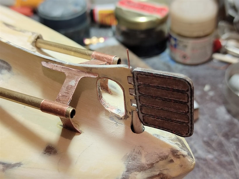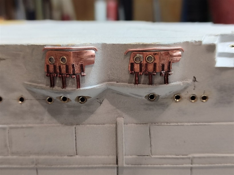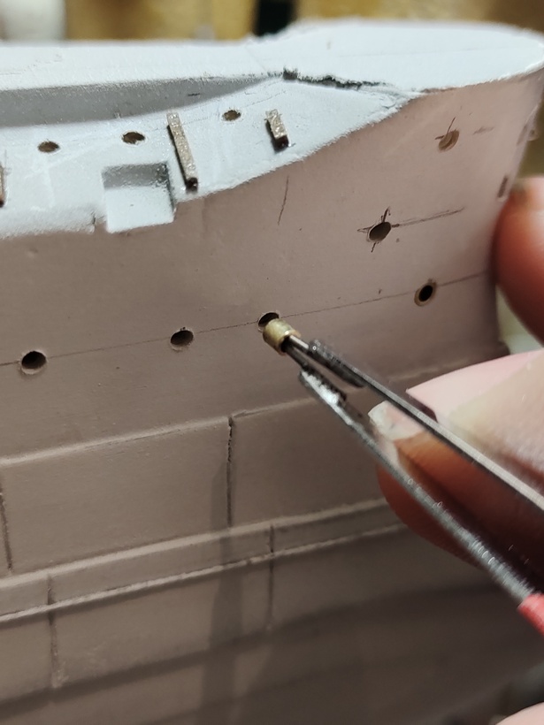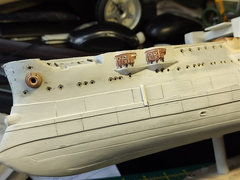 Затем установка "ресничек". До этого выточил и установил якорные клюзы с крышками.