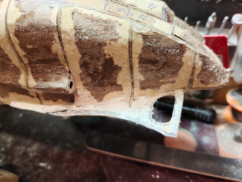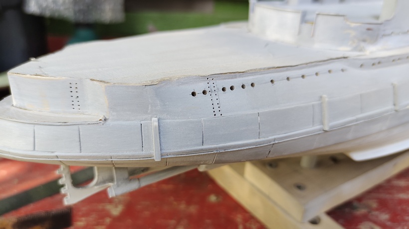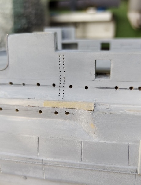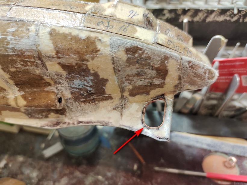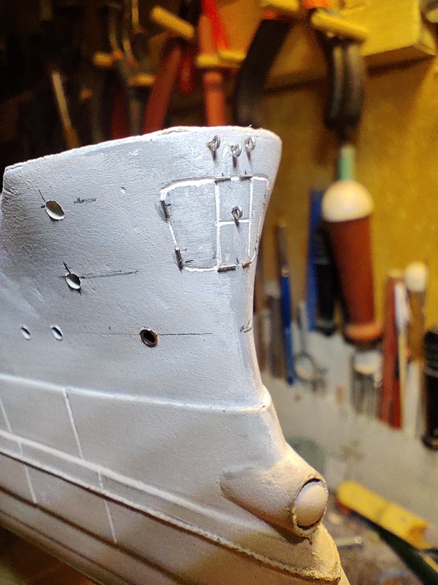 Разметил и просверлил отверстия в корпусе под иллюминаторы. А, так же отверстия под скоб- трапы.