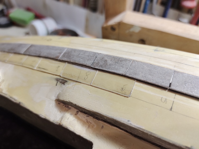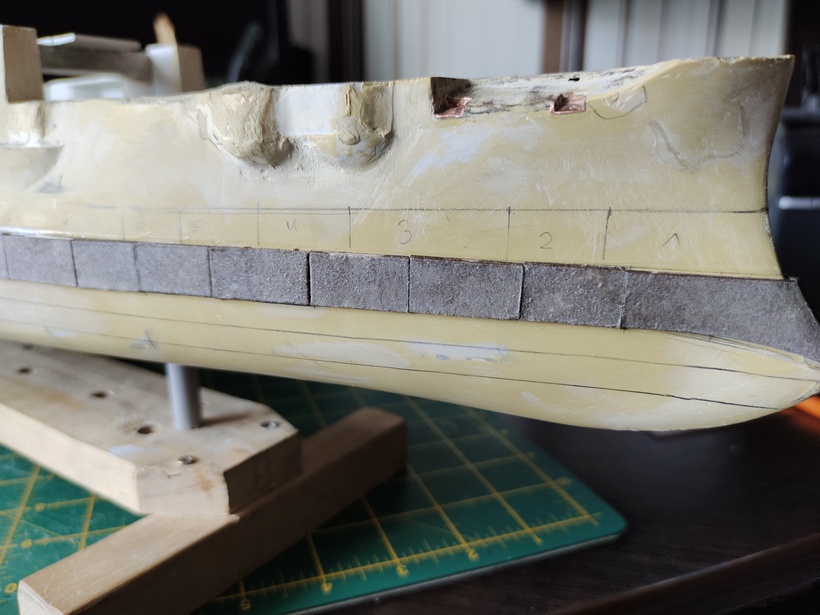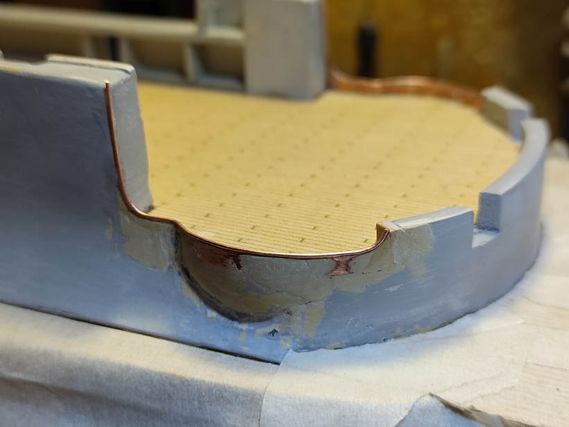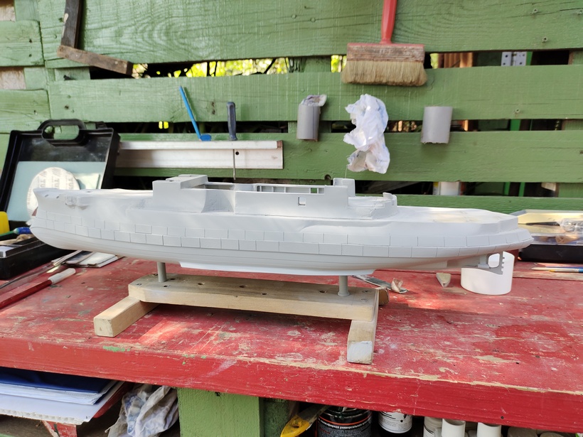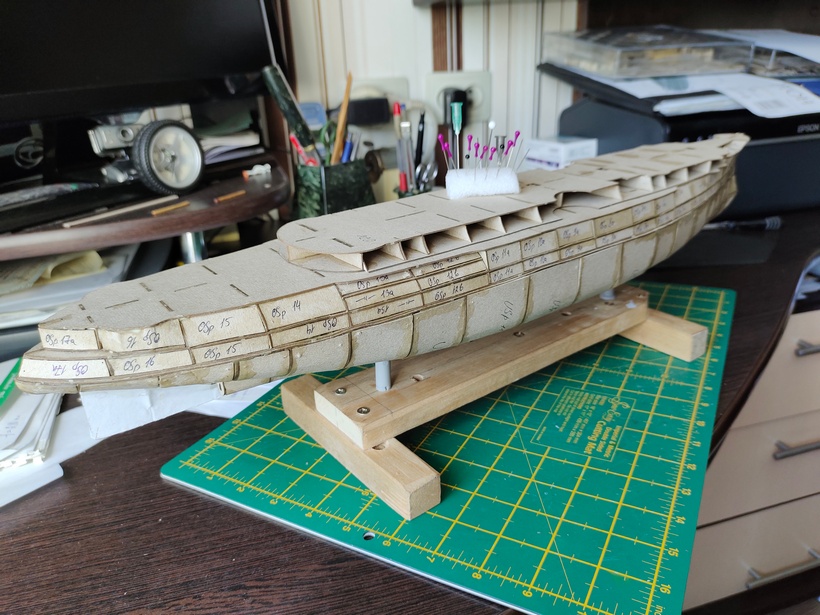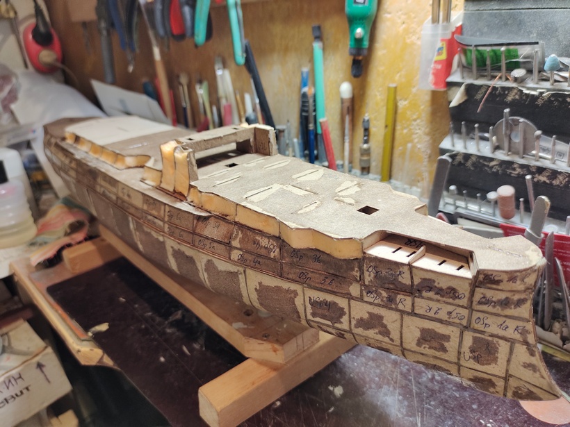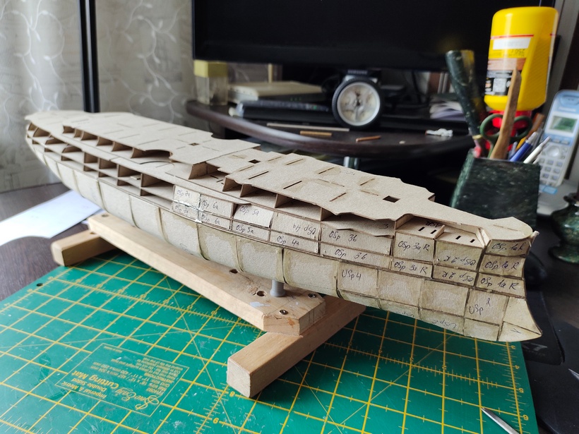 После подготовки корпуса нанес броневые пояса. Основной (нижний) из того же картона, что и корпус.