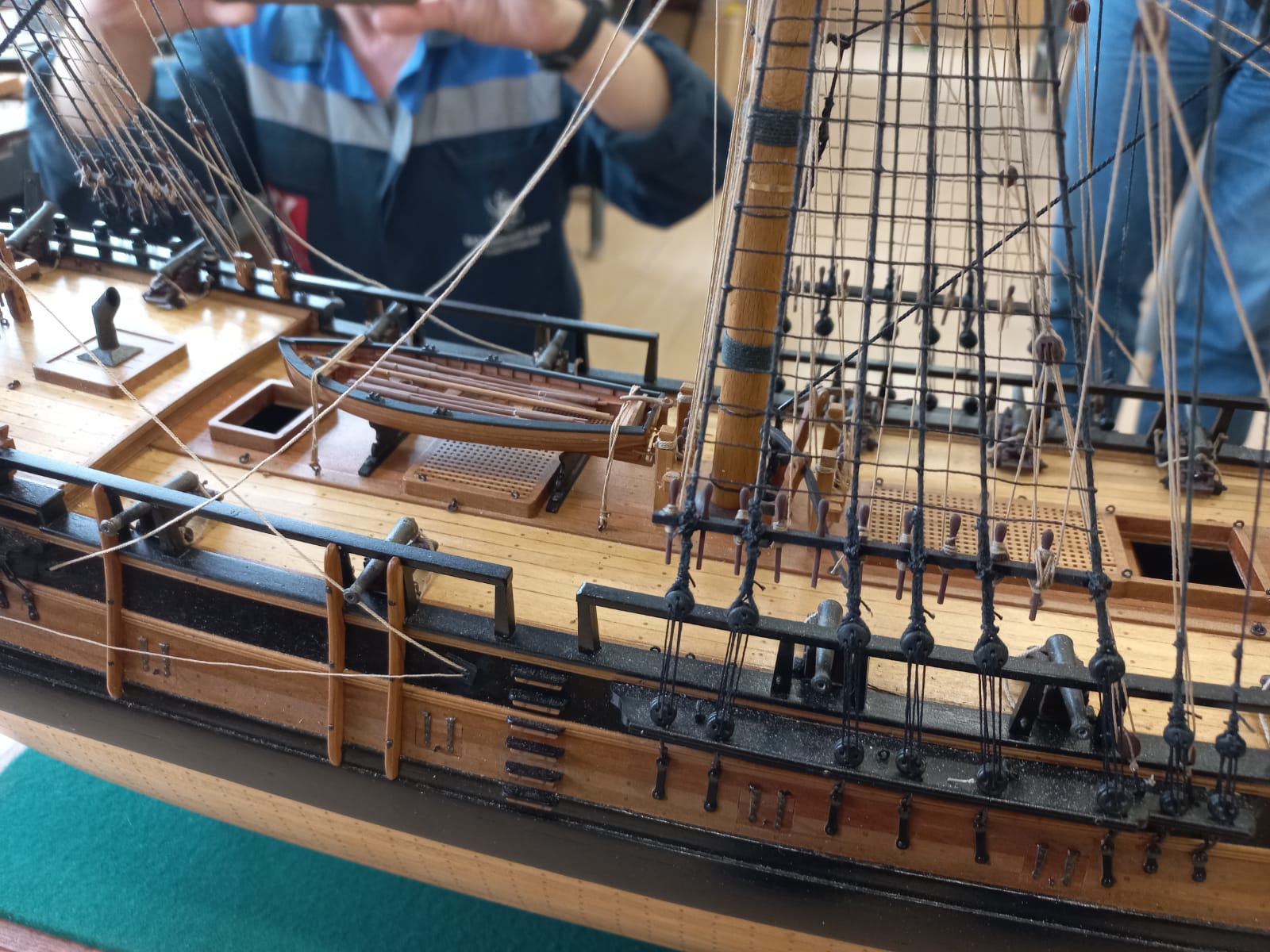 Подойти можно ровно туда, где мы втроём сфотографировались. Ближе уже стекло витрины. Модель поставили очень высоко, так, что палубу рассмотреть совершенно не возможно
