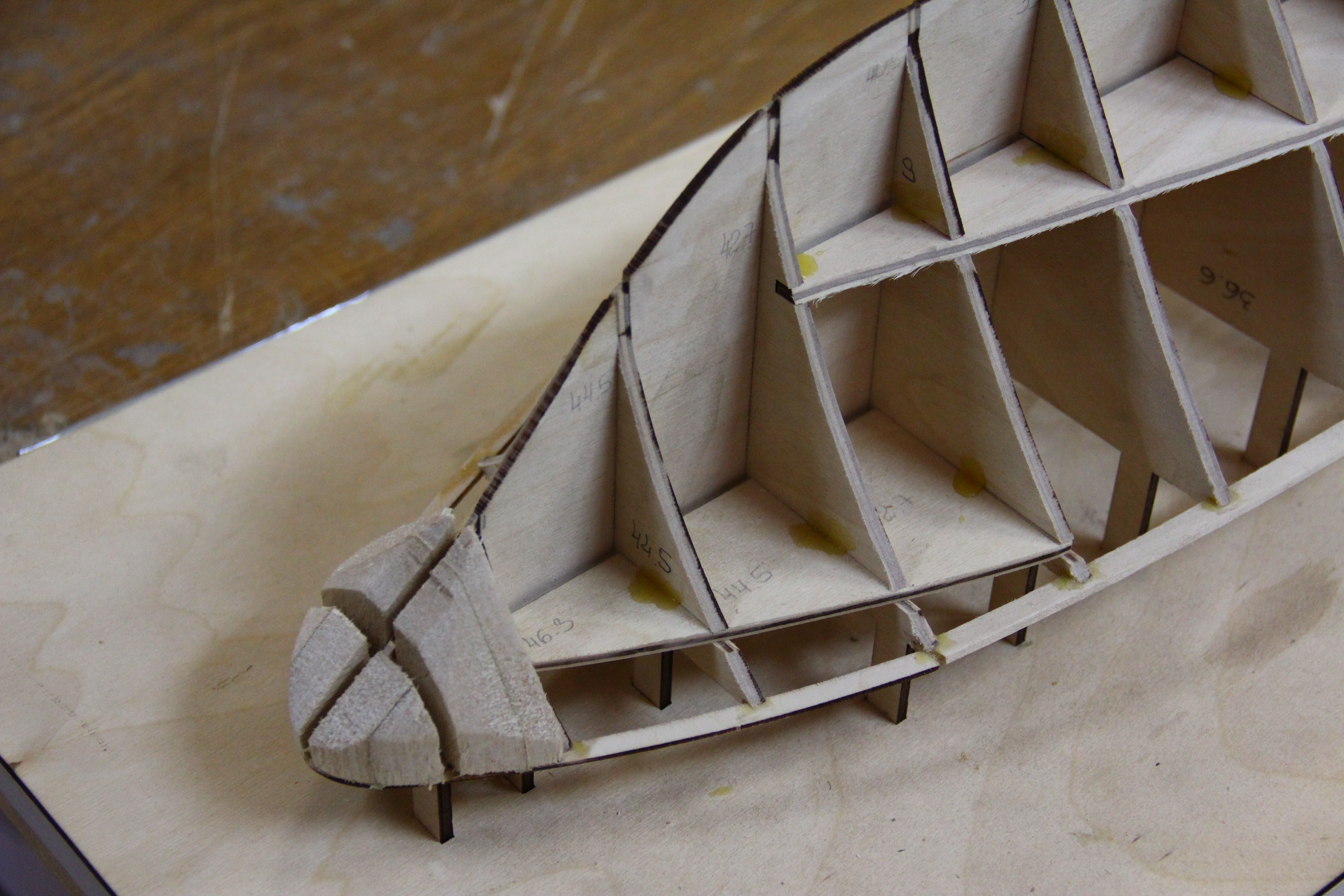 На шпангоуты клею усиление на призме. На носовые с кормы. На кормовые с носа.