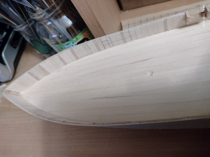 С кормой я еще подумаю, как лучше поступить. Обычно круглую корму формирую вертикальными чаками. Но это будет зависеть от того, как лягут рейки. Можно  попробовать изловчиться и загнуть их буквой "зю".
