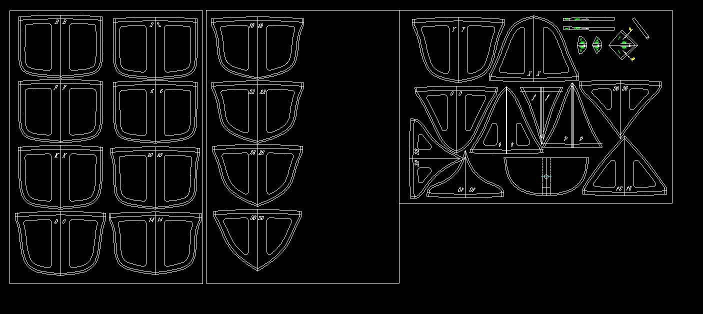 Используя ватерлинии, рыбины и т.п. строю профиль трех поворотных шпангоутов, развернутых на плоскость.