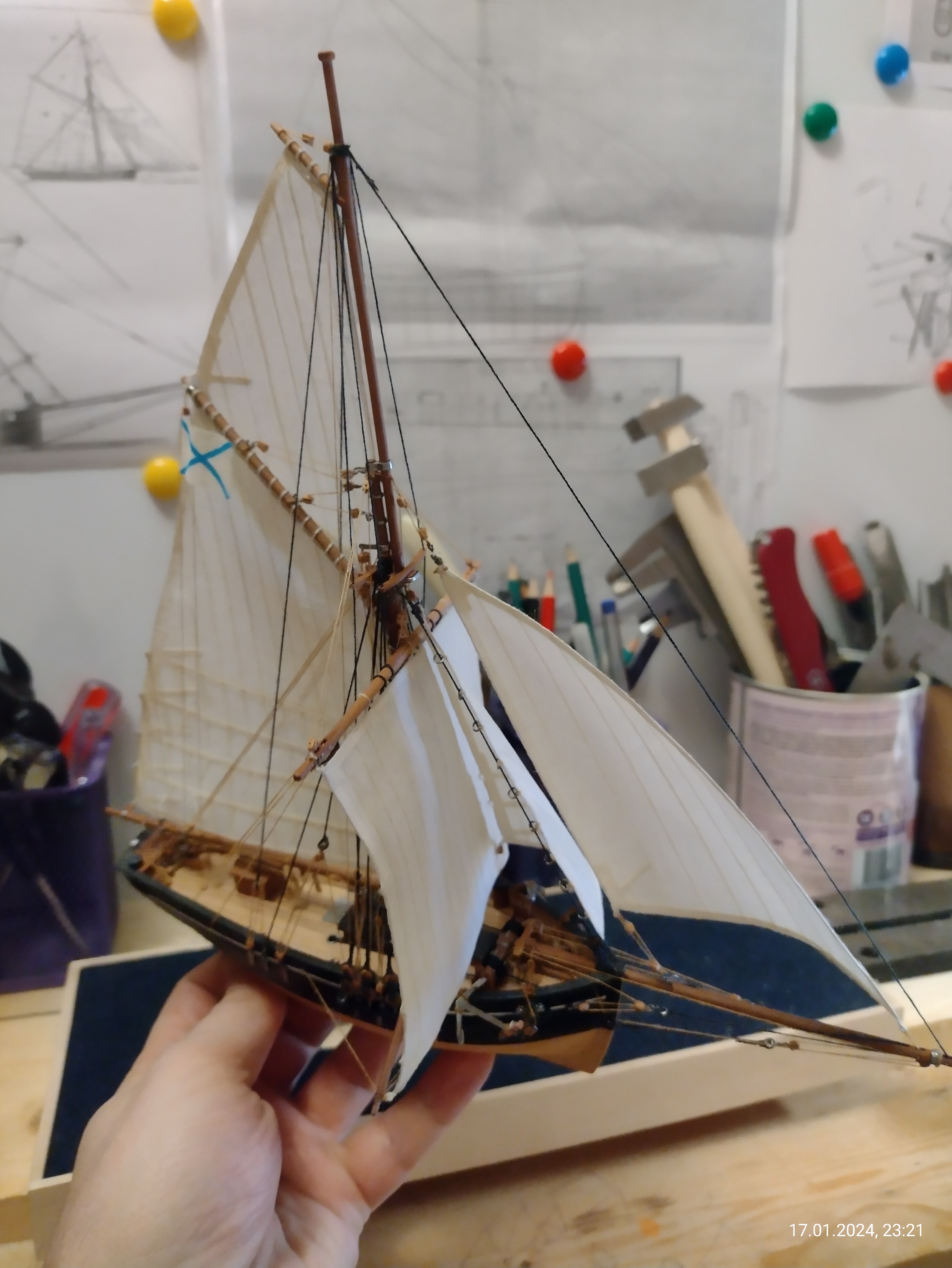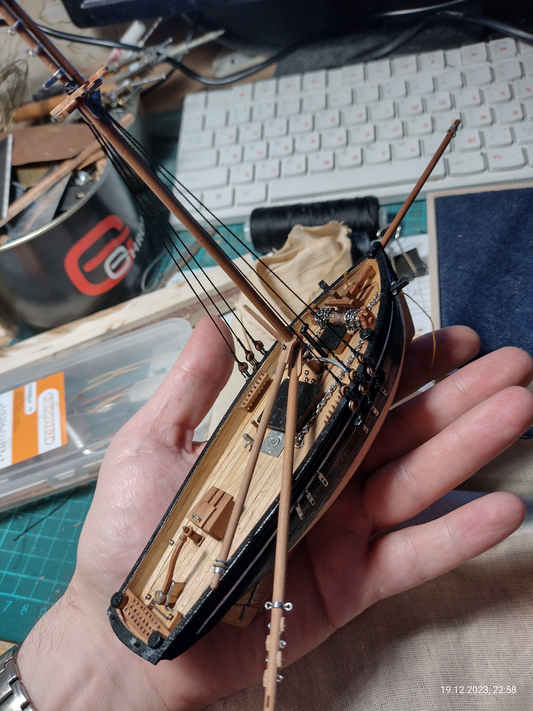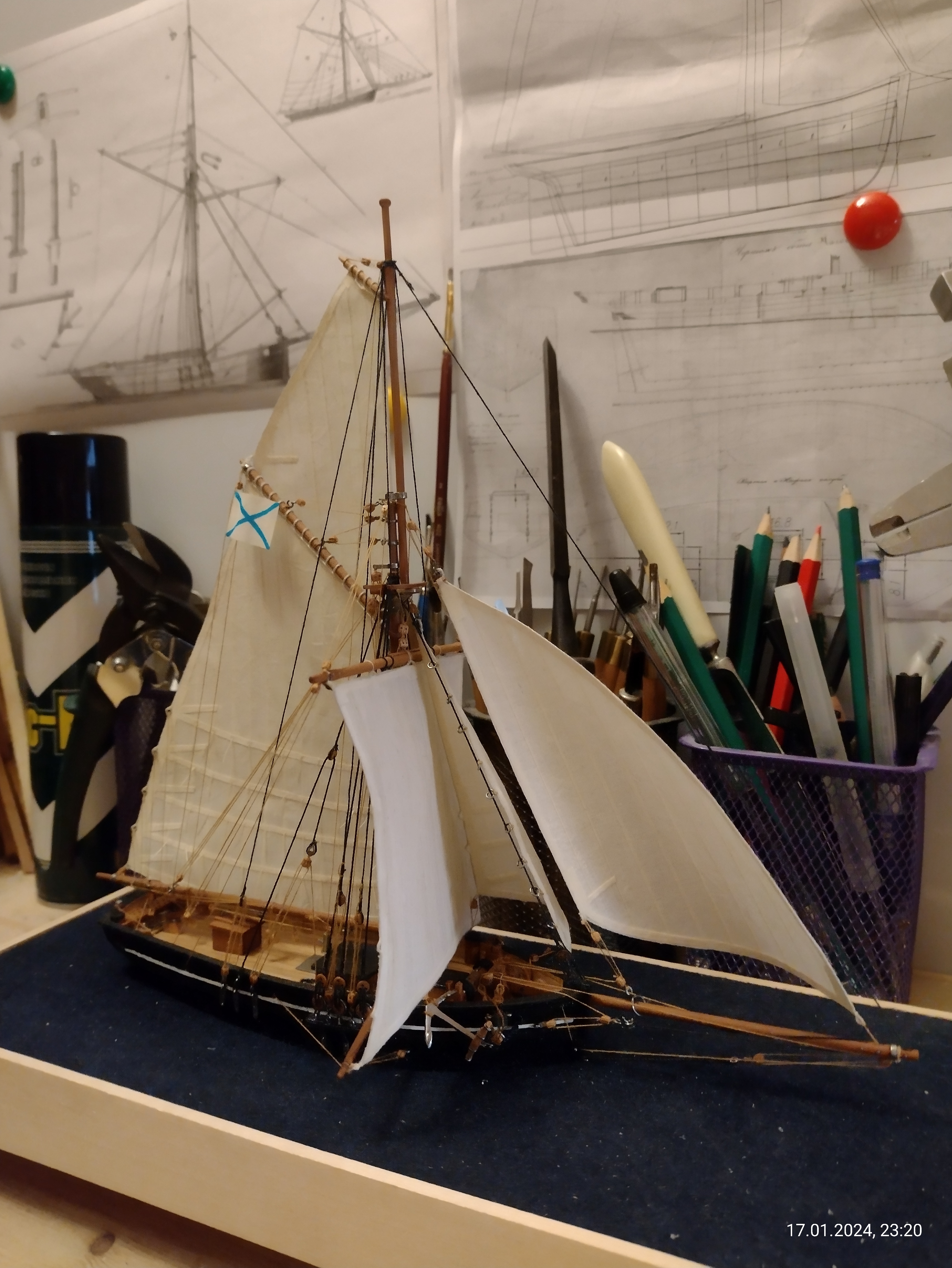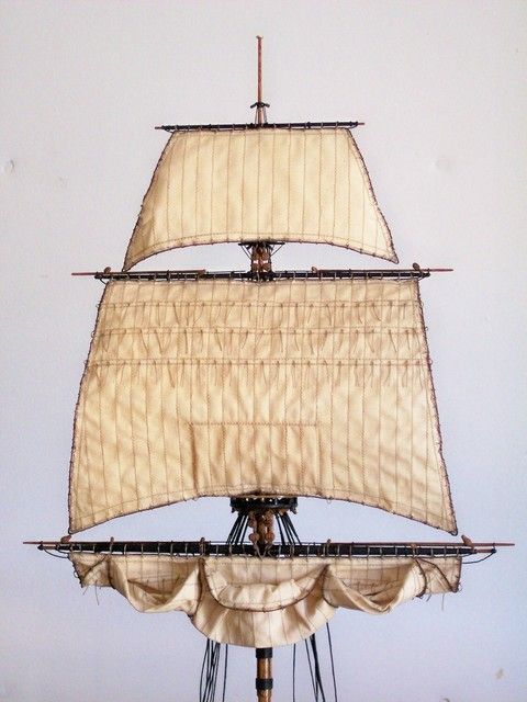Есть сильное желание сделать всё в полном парусном комплекте, т.к. в оснастке вся фишка этого корабля, бот-тендера. Да и брифок не частый гость на моделях.