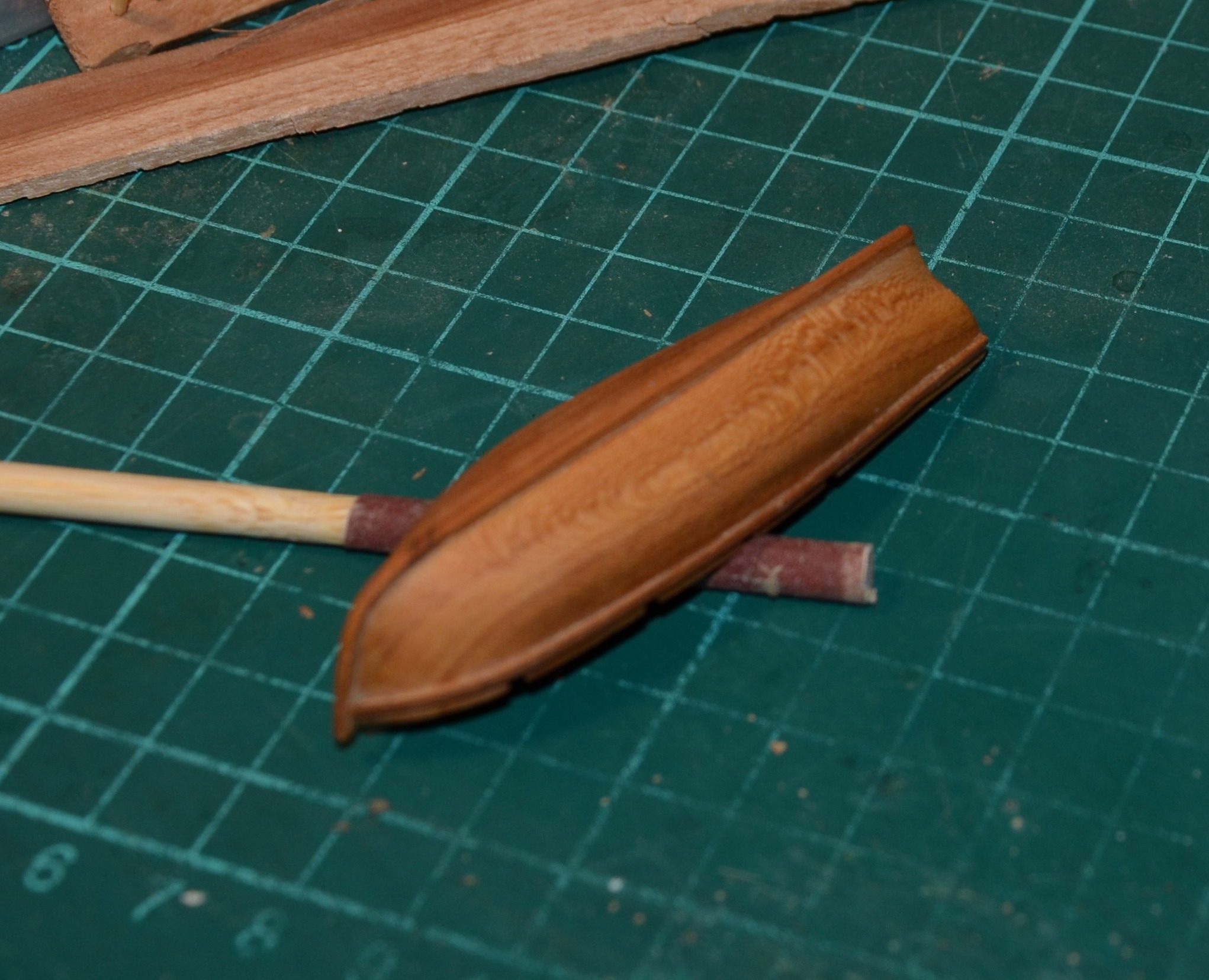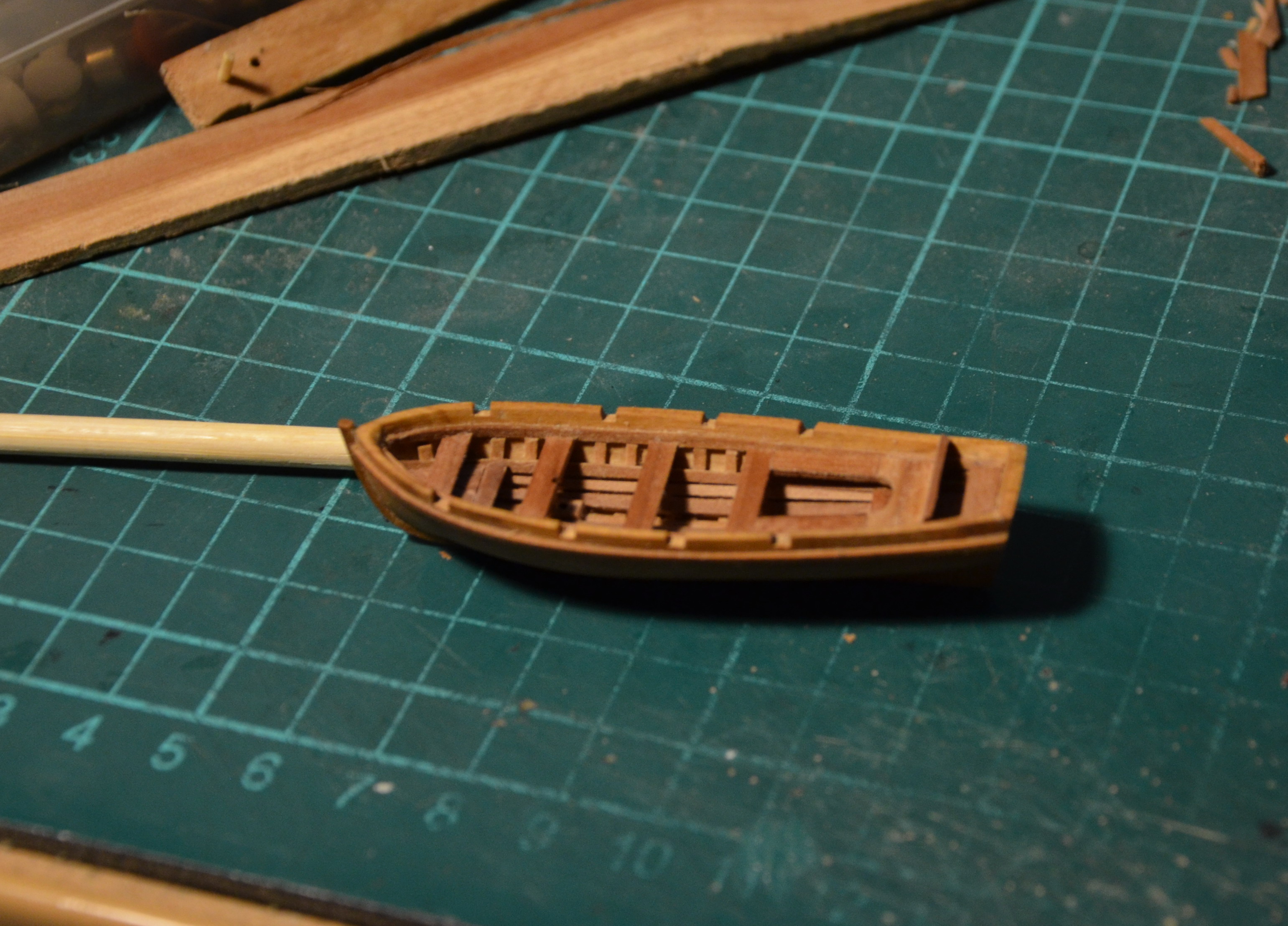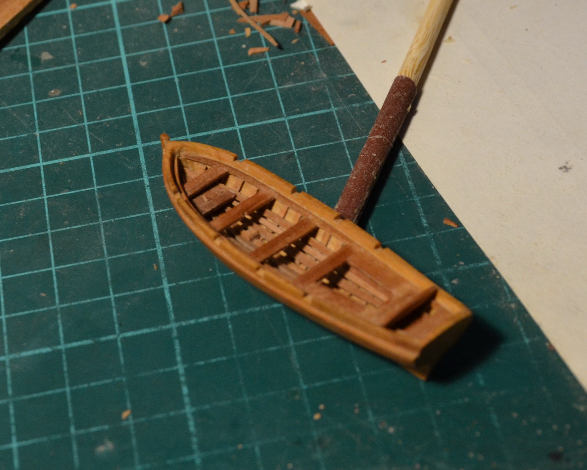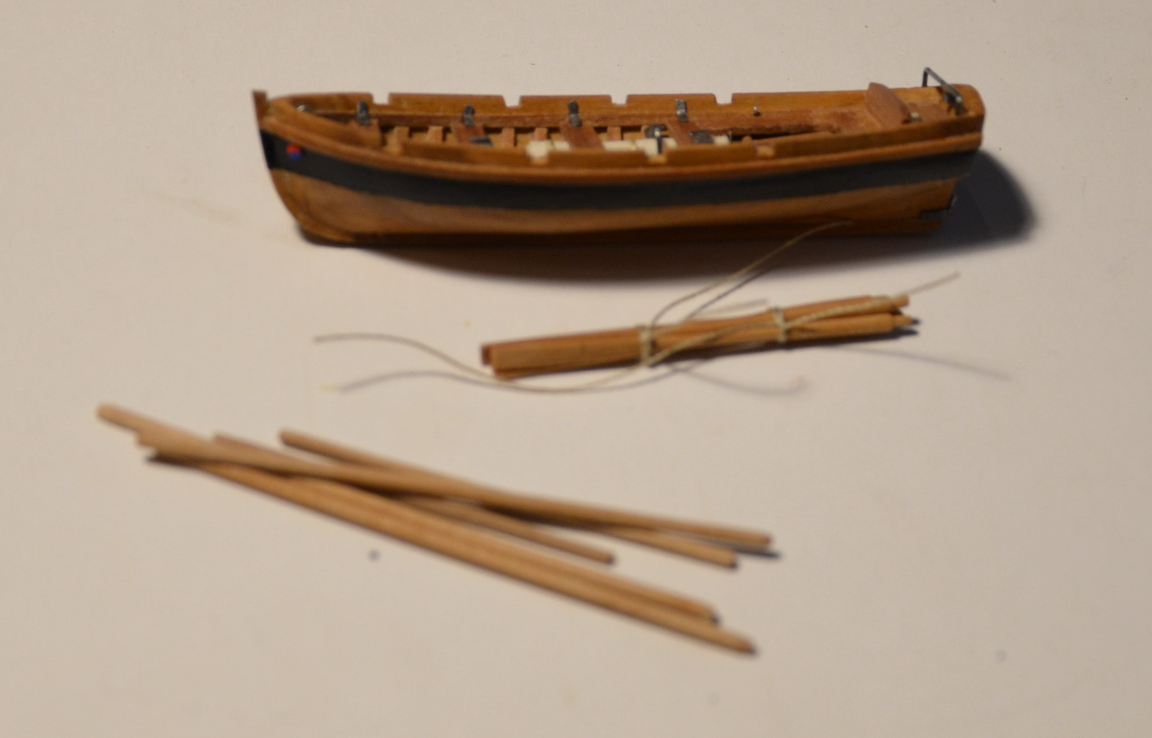 Следующий этап это установка скобяных изделий (их там масса), изготовление рангоута, руля с румпелем, паруса (парусов) в чехле, дрека (надо поискать как выглядел), и восемь весел.