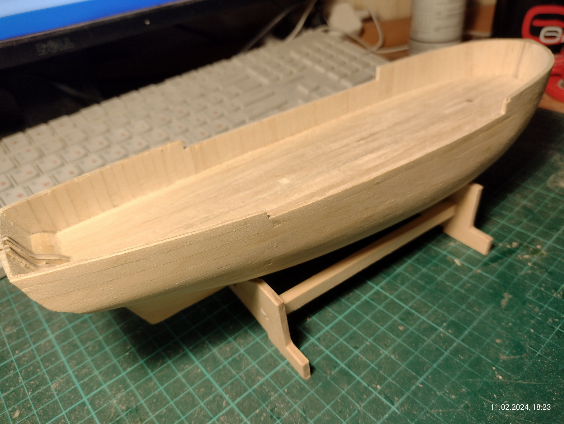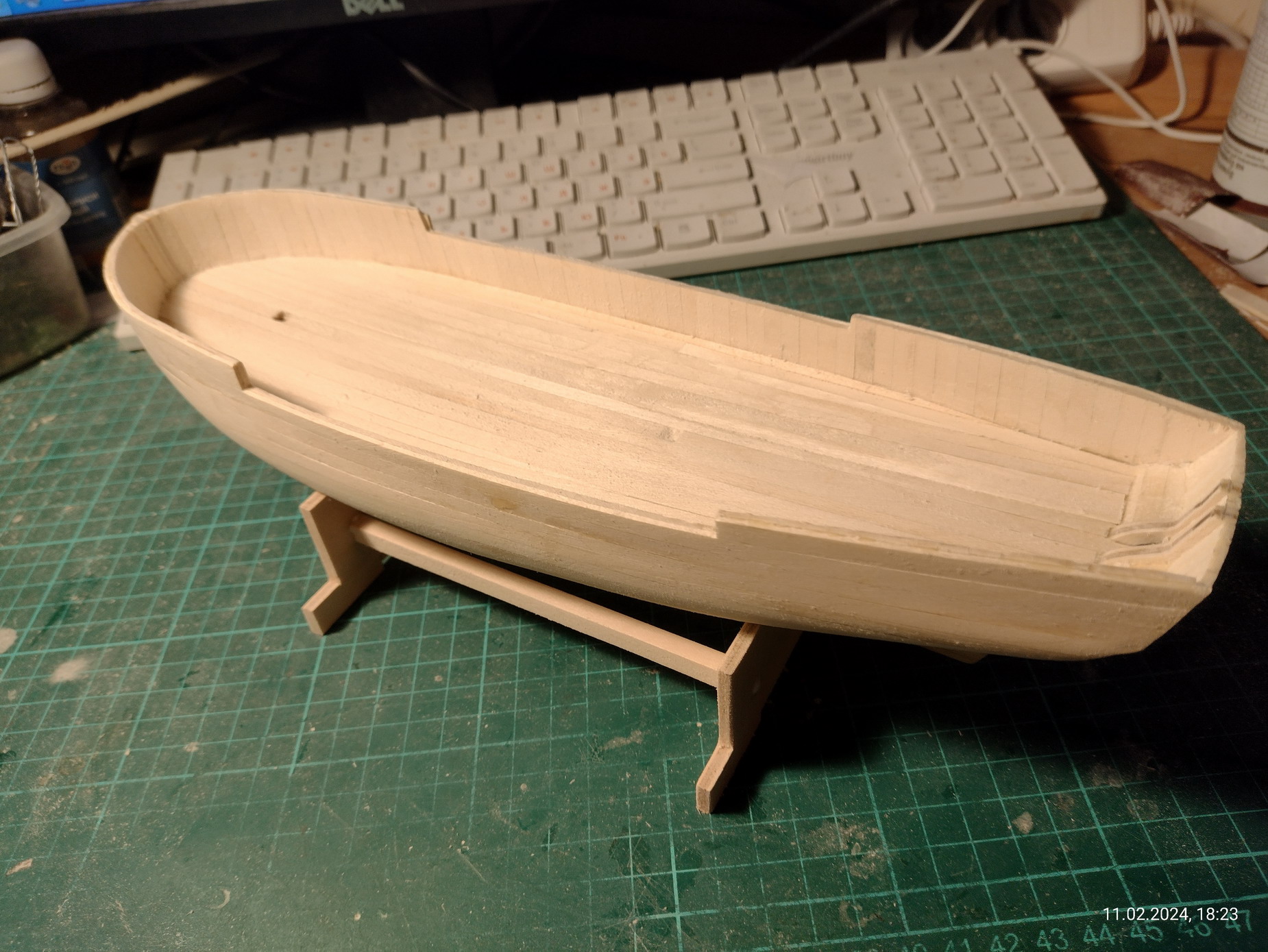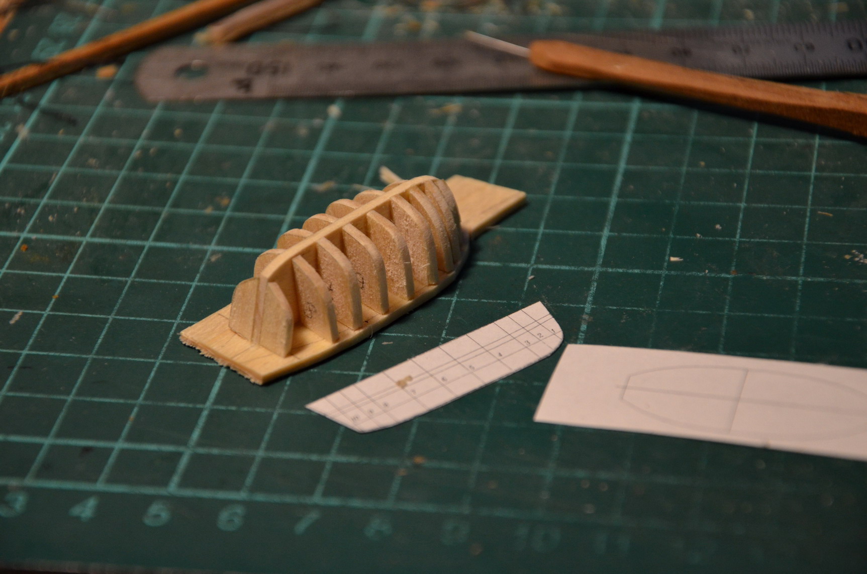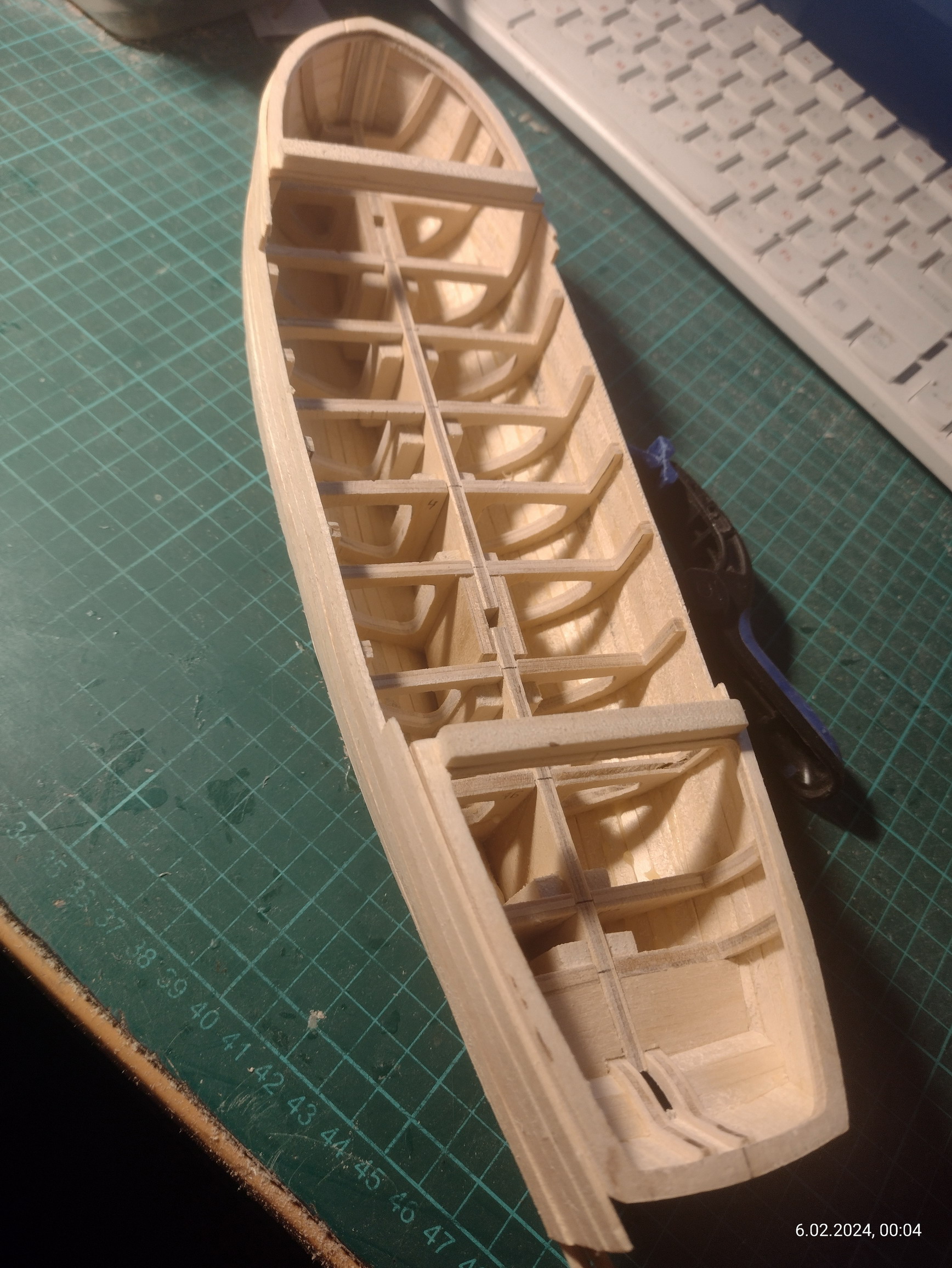 Следующий этап это установка скобяных изделий (их там масса), изготовление рангоута, руля с румпелем, паруса (парусов) в чехле, дрека (надо поискать как выглядел), и восемь весел.