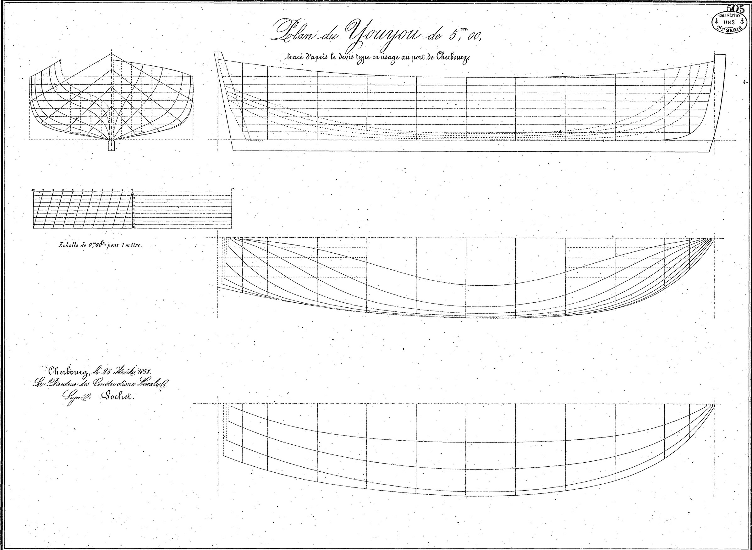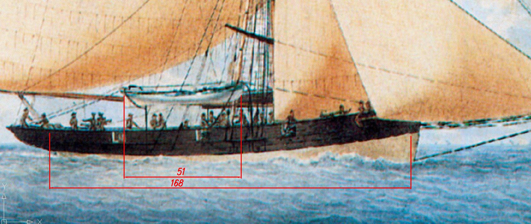 Т.к. к середине 19-века они уже были давно стандартизированы по длине, то понятно, что это 5-метровый ял. 100мм отнесем к погрешности измерений.
