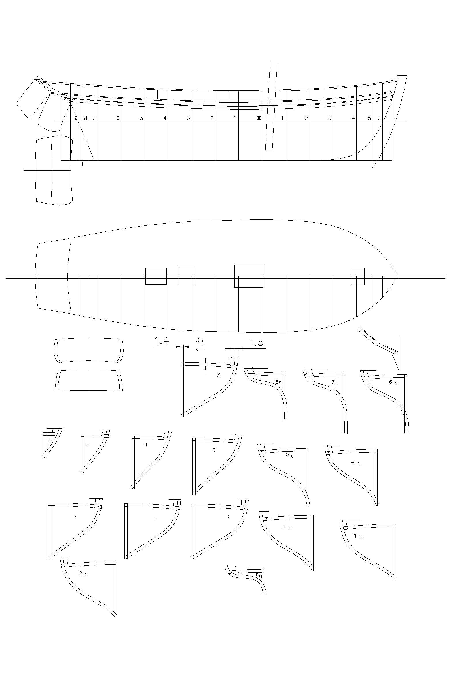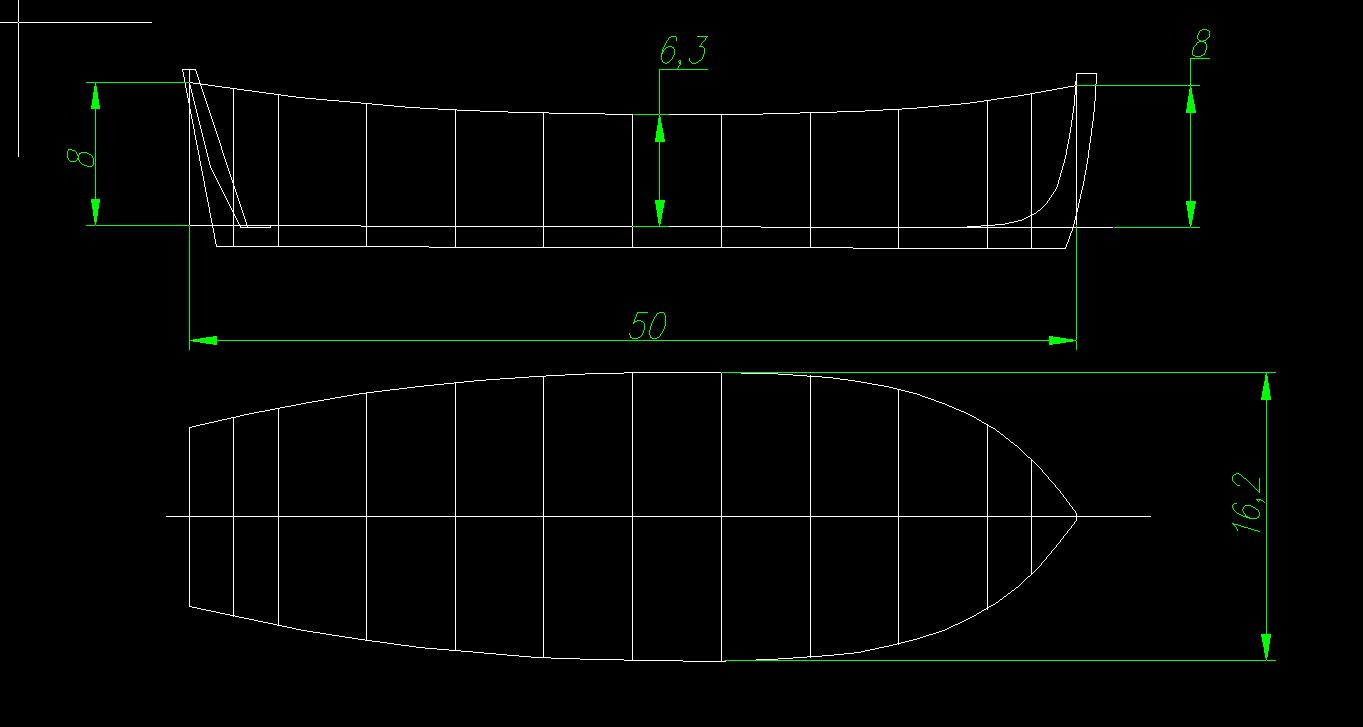 Всё. Теперь можно распечатать чертеж, перенести на древесину и изготовить два таких ялика длиной по 50 мм.