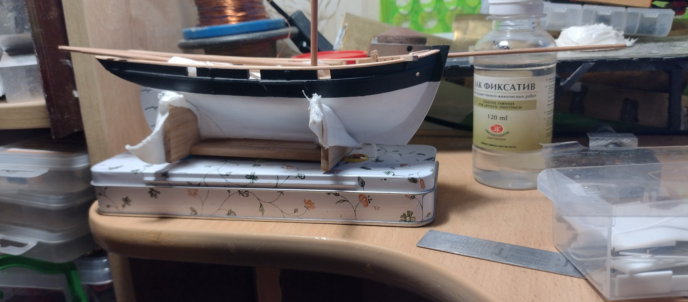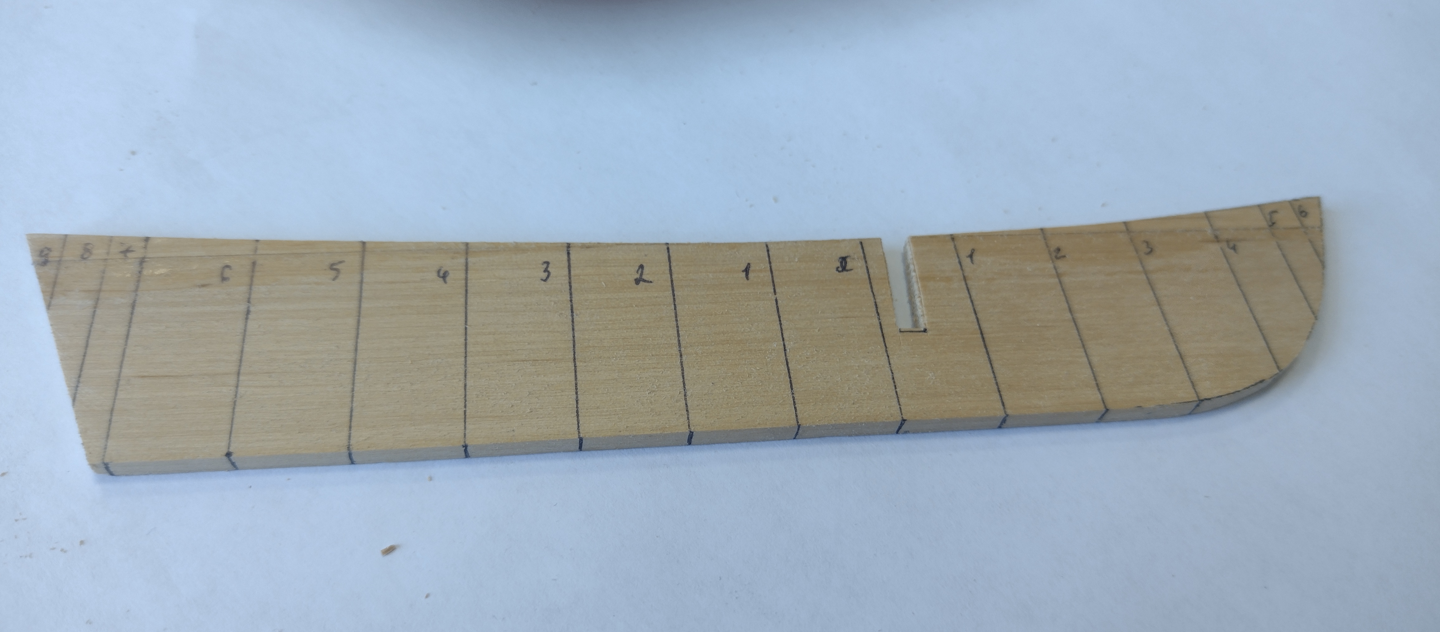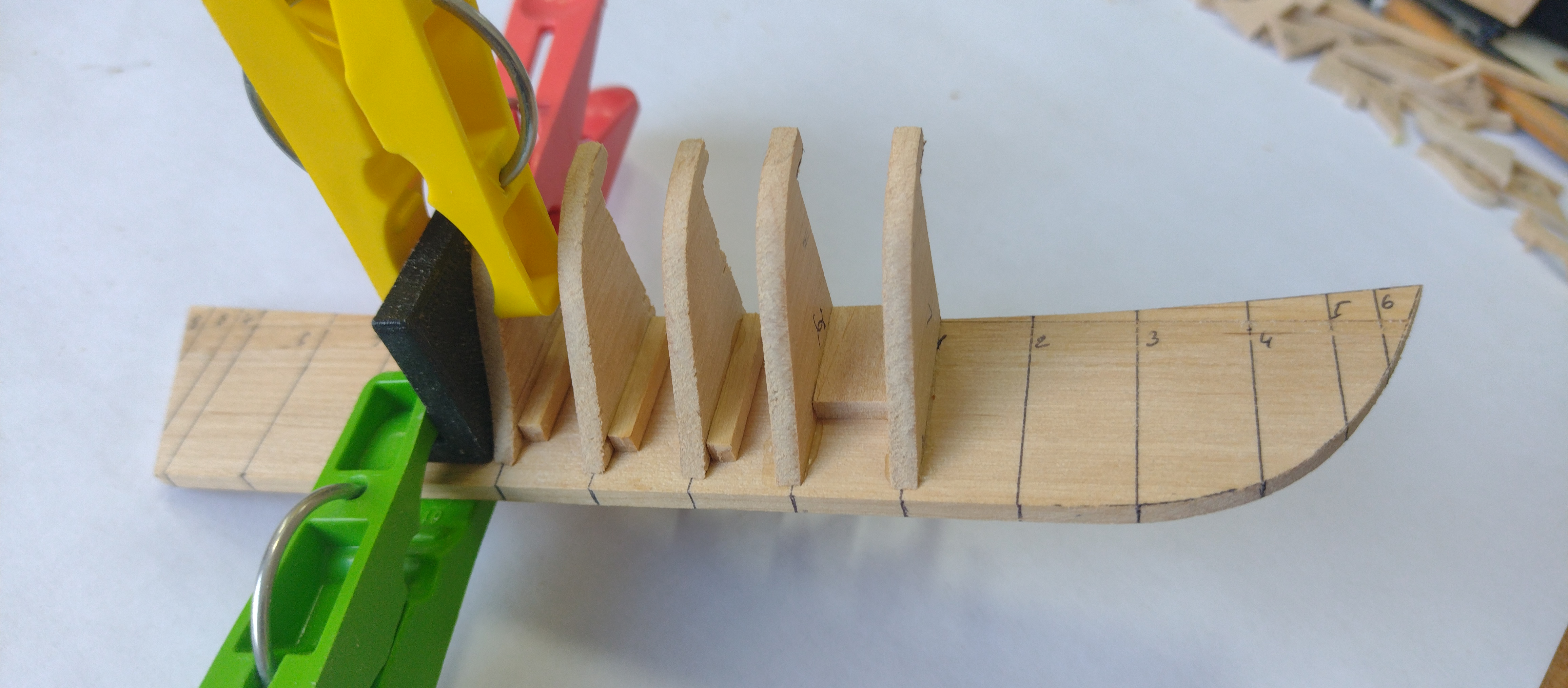 Обычно клею шпангоуты постепенно от миделя в нос и корму, но сейчас, для фото, сделал попроще.