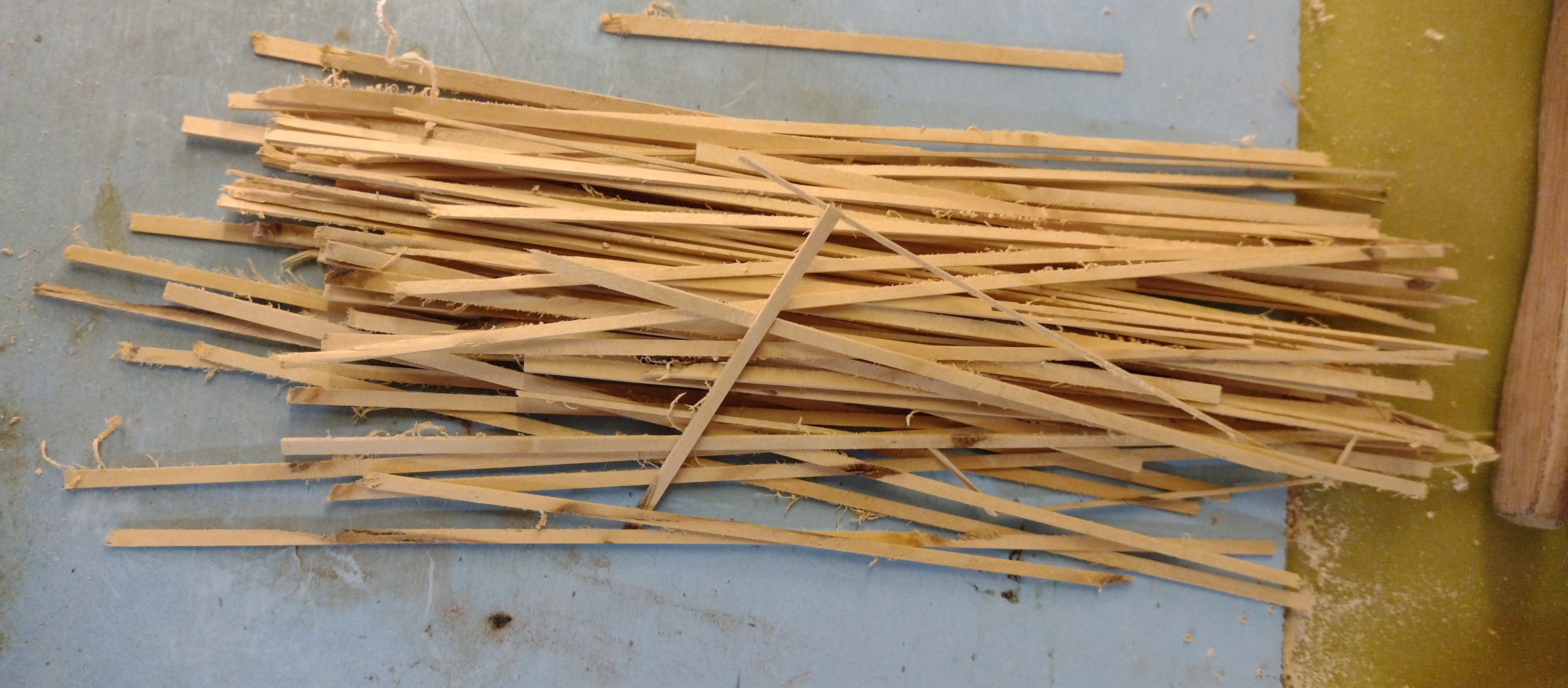взят мидель. Померил материал, который у меня есть. Это плашка для килевой рамки толщиной 2,8мм. И рейки для черновой обшивки палубы и борта. Они толщиной 1,5мм.