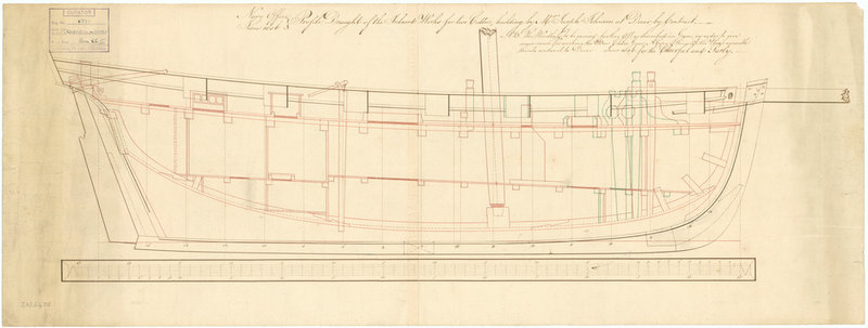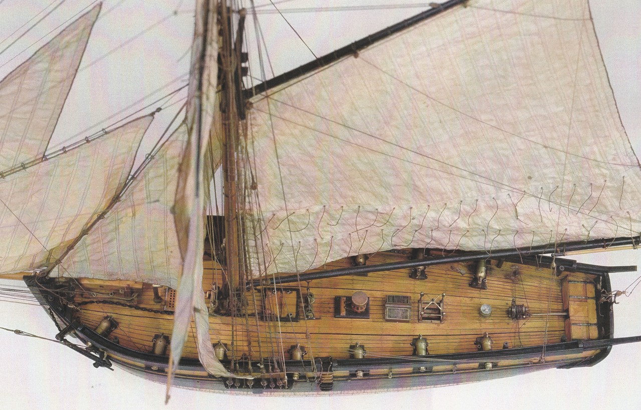 На "сувенирном" чертеже куттер изображен упрощенно, а местами вообще схематично. Поэтому большим подспорьем в работе является картина Фредерика Ру, на которой куттер показан довольно подробно. Некоторые детали картины напрямую говорят о том, что куттер рисовали с натуры. Это подтверждается самим творчество Фредерика Ру, довольно внимательно относившегося к деталям.