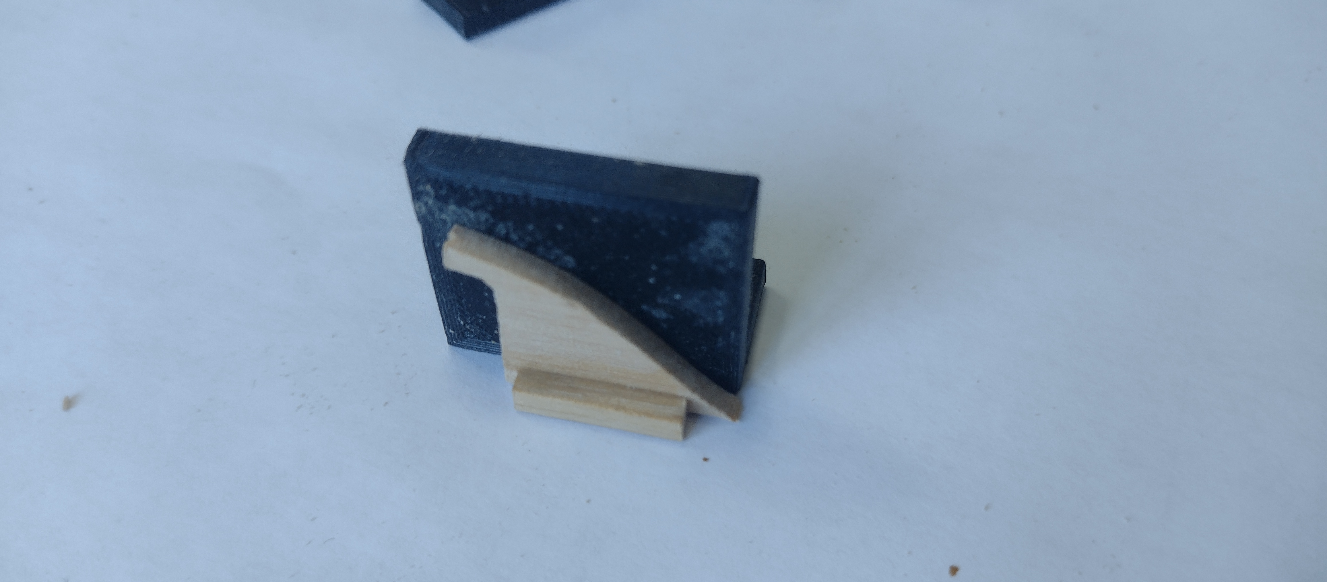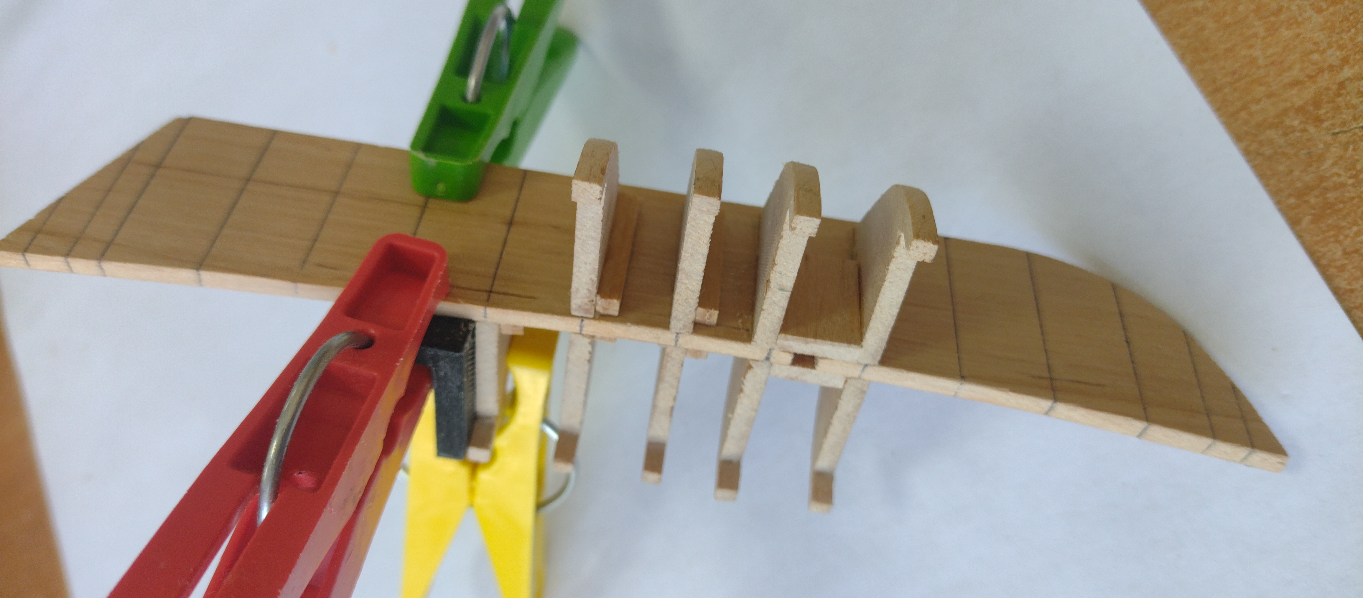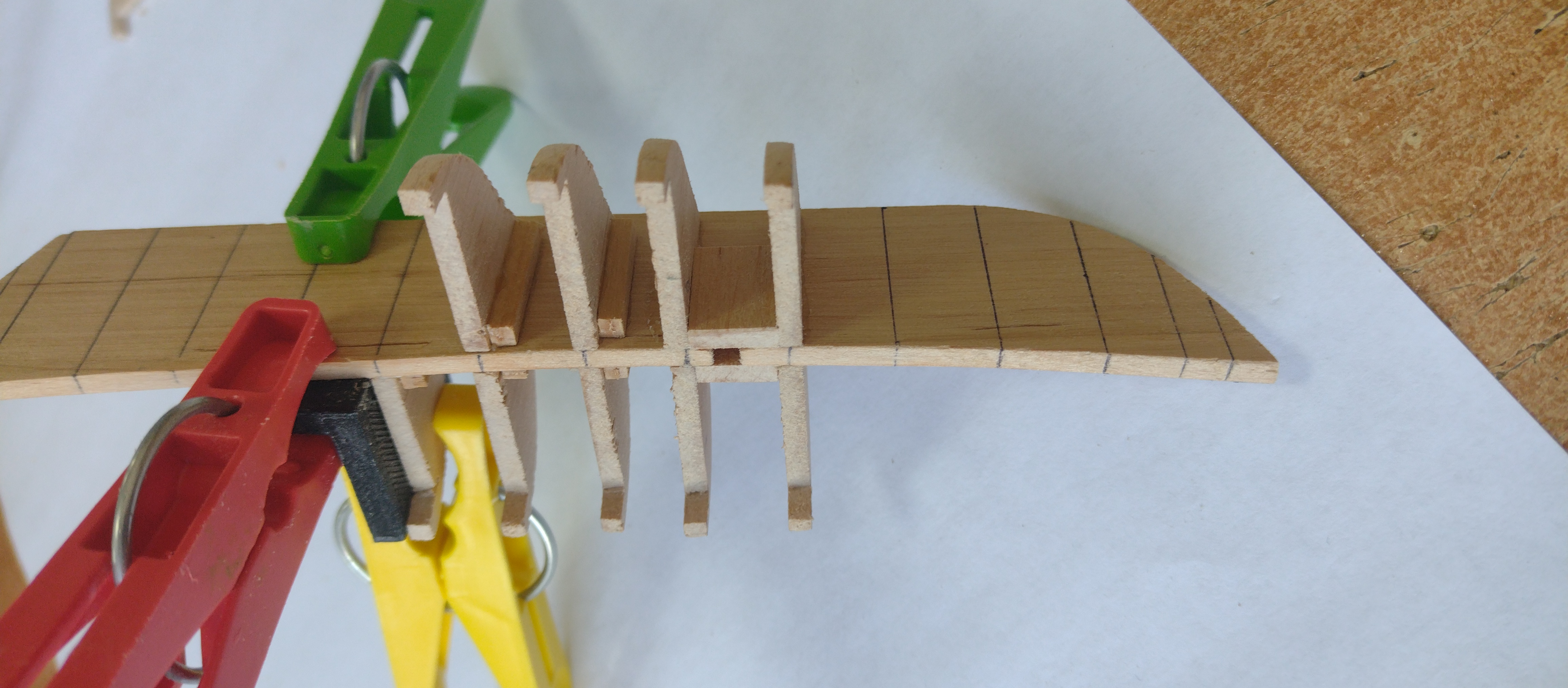 Сверху на торцы шпангоутов поставил...э.. я это называю, формирователь обводов. Такие детали, которые нужны для придания плавности обшивке, для удержания шпангоутов на своих местах, когда на них давят прижимаемые к ним рейки и за них удобно цепляться прижимами.