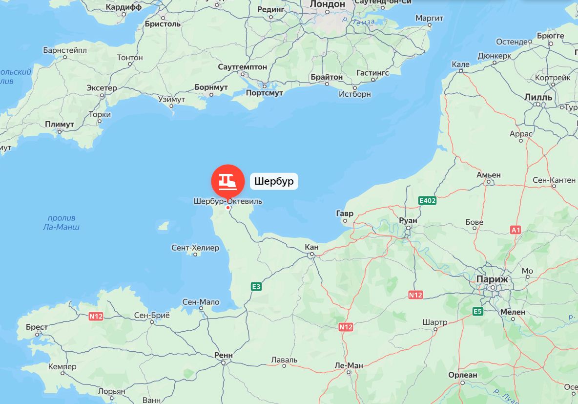 Шербур, это понятно где. Париж справа, Шербур слева, Лондон сверху.