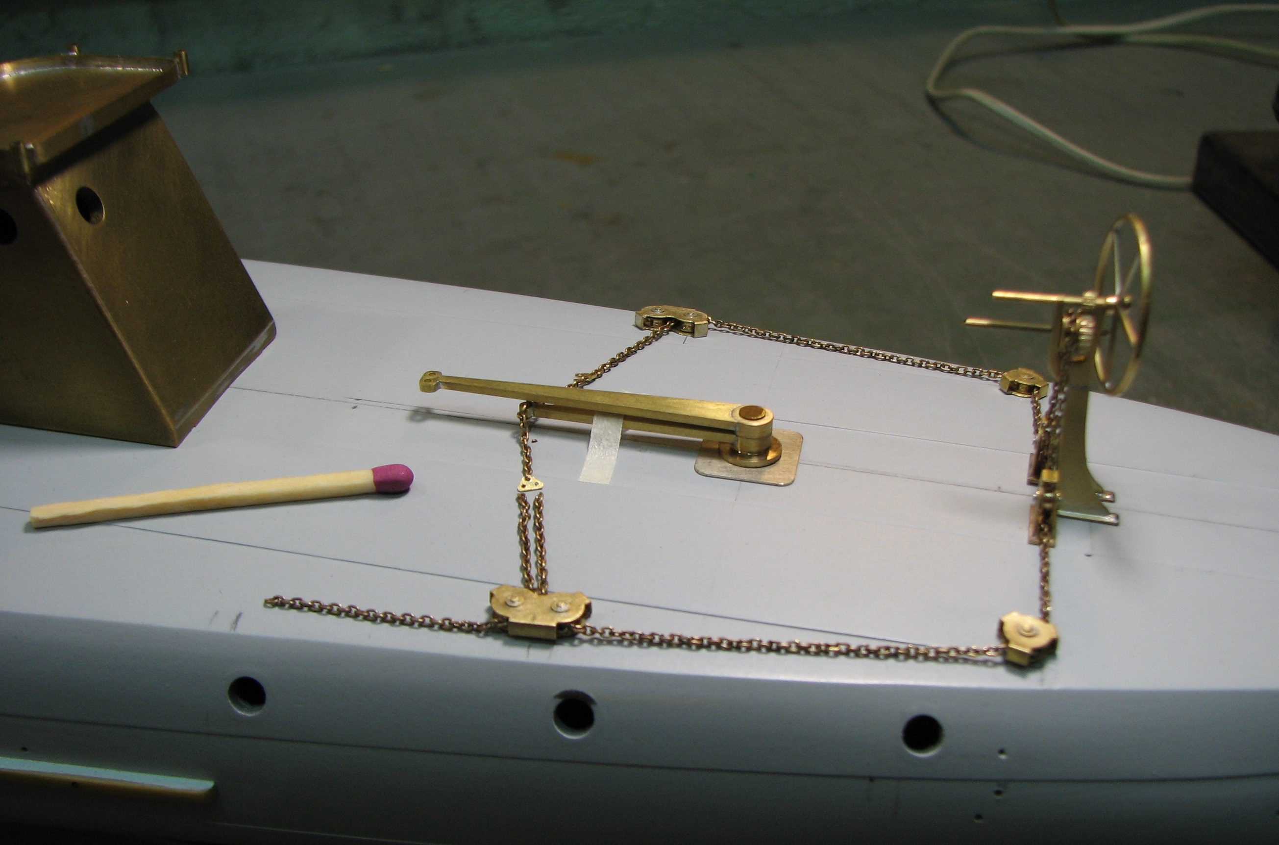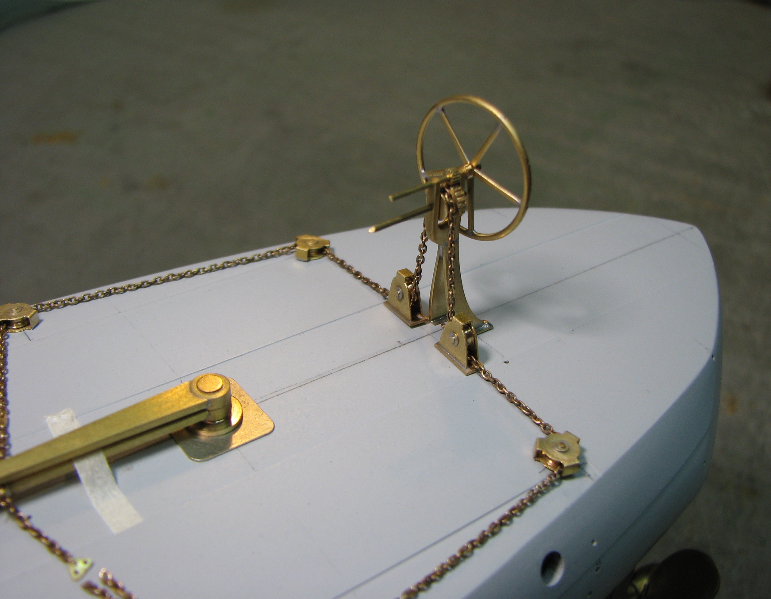 Обрати внимание, что на поздних фото видно, что на румпель идёт только один штуртрос (который носовой).