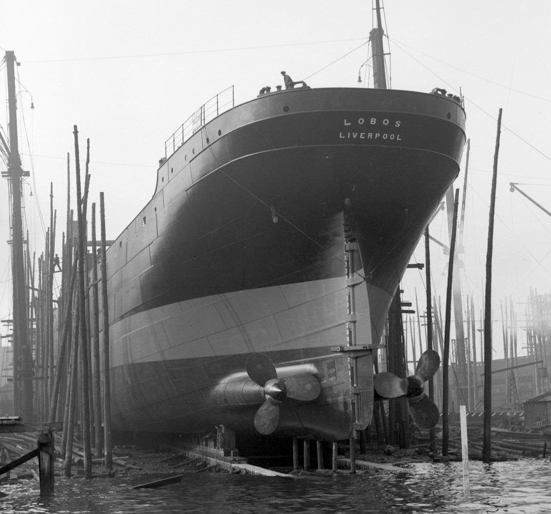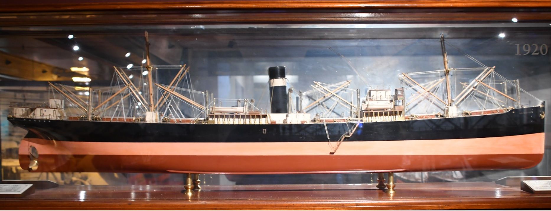 Нарядный вид. Но все равно видно, что трамп-трудяга. Его бы ржавой краской покрасить, трубу помять, небритого боцмана с кувалдой в руках, у якоря поставить. Стекло в рубке разбить. На палубе что-нибудь разбросать, облезлый английский флаг на гафель. И будет такой образ парохода, от Ливерпуля до Кейптауна, имя которым миллион. И на Первую мировую хорош и на Вторую и на Третью.