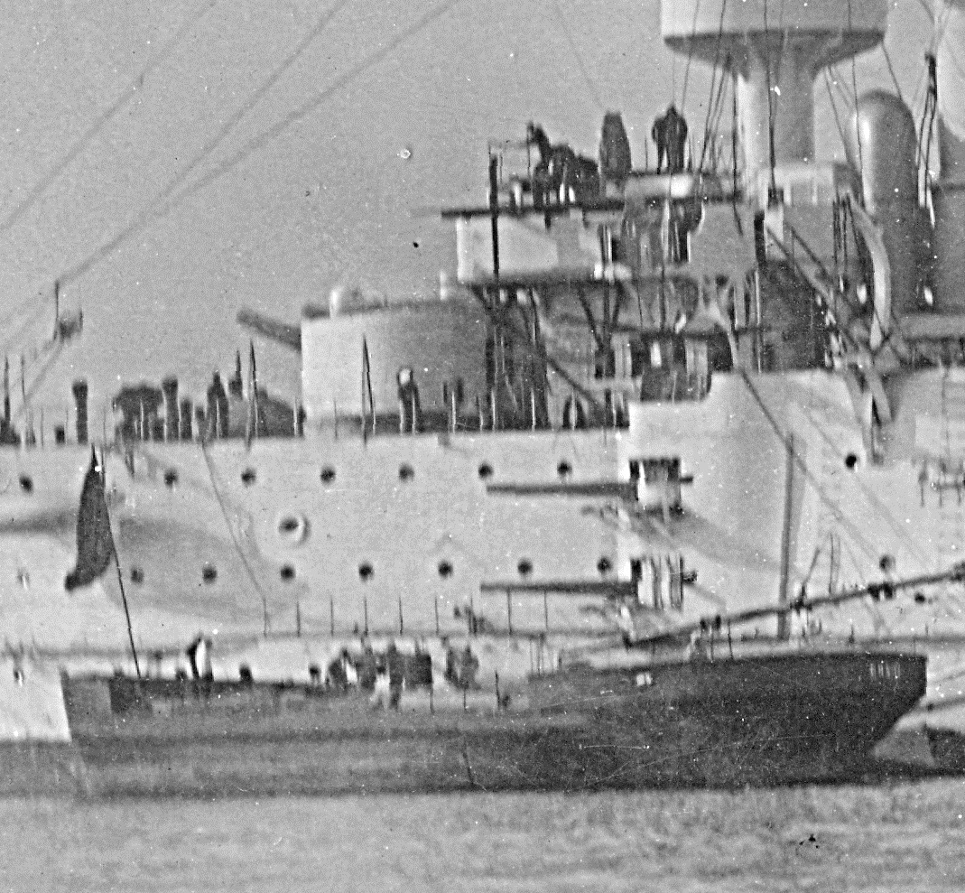 При погрузке боеприпасов поднимали флаг Н , однородное красное полотнище. На этом фото мы его и наблюдаем на барже и на грот-мачте броненосца.