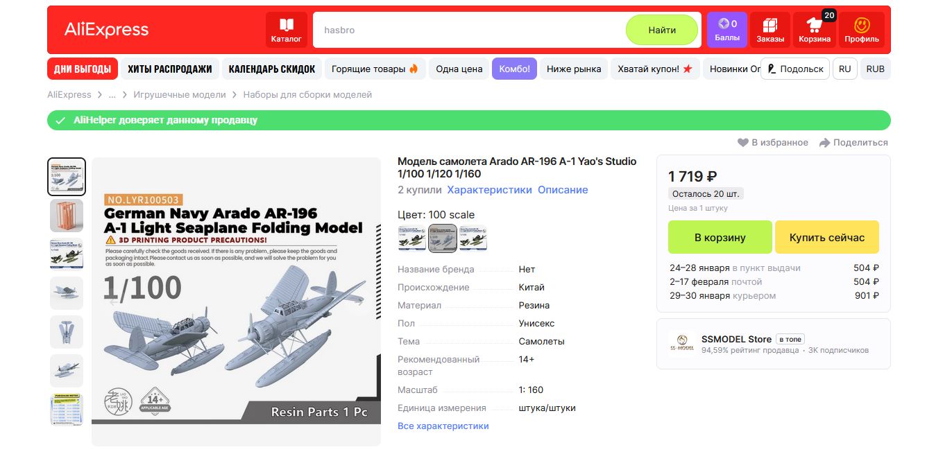 Уважаемый Алексей, нашёл в интернете эту фирму, есть и Arado Ar-196 в 1\100! Стоит, правда, недёшево - около 6 т.р. (знают,собаки, что в сотке делается немало моделей) но что делать, копийность дороже, так что как получу пенсию, возьму для Сергея Ивановича!