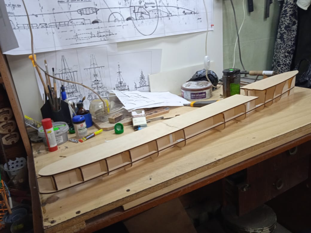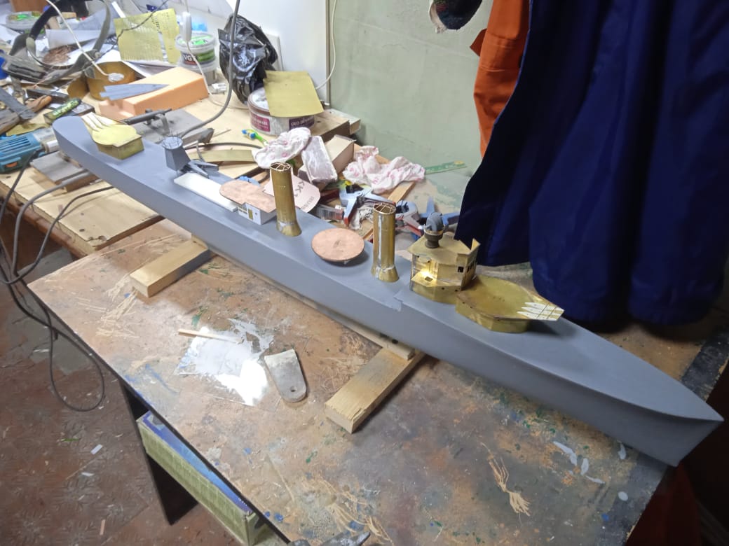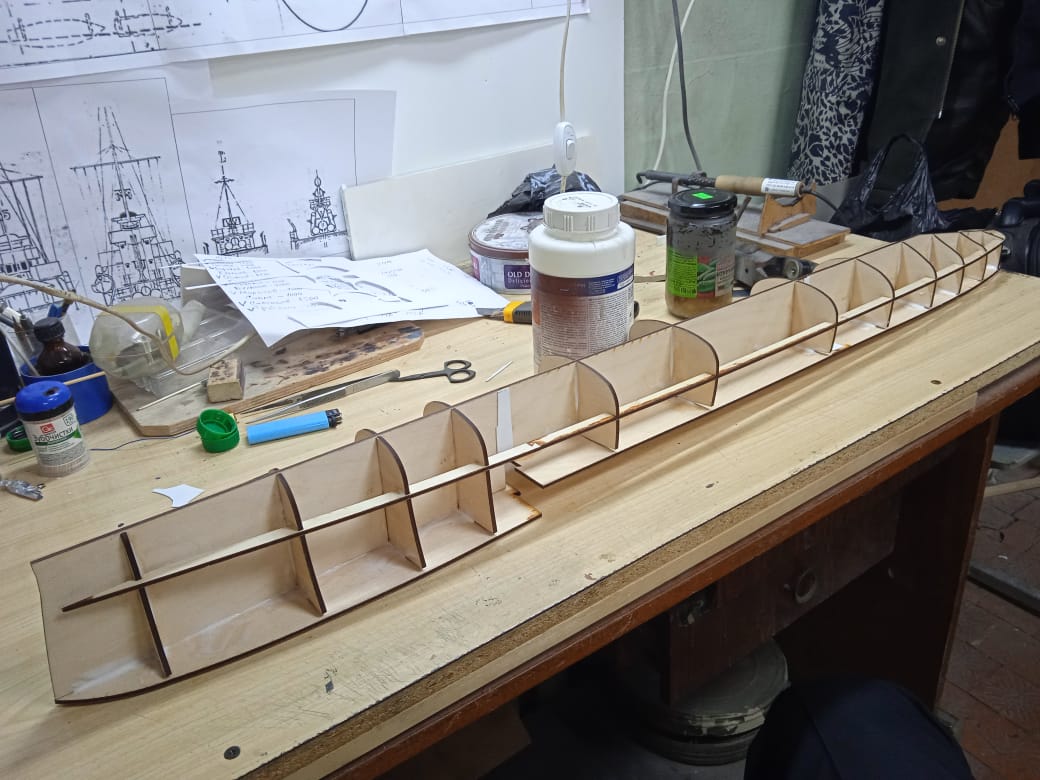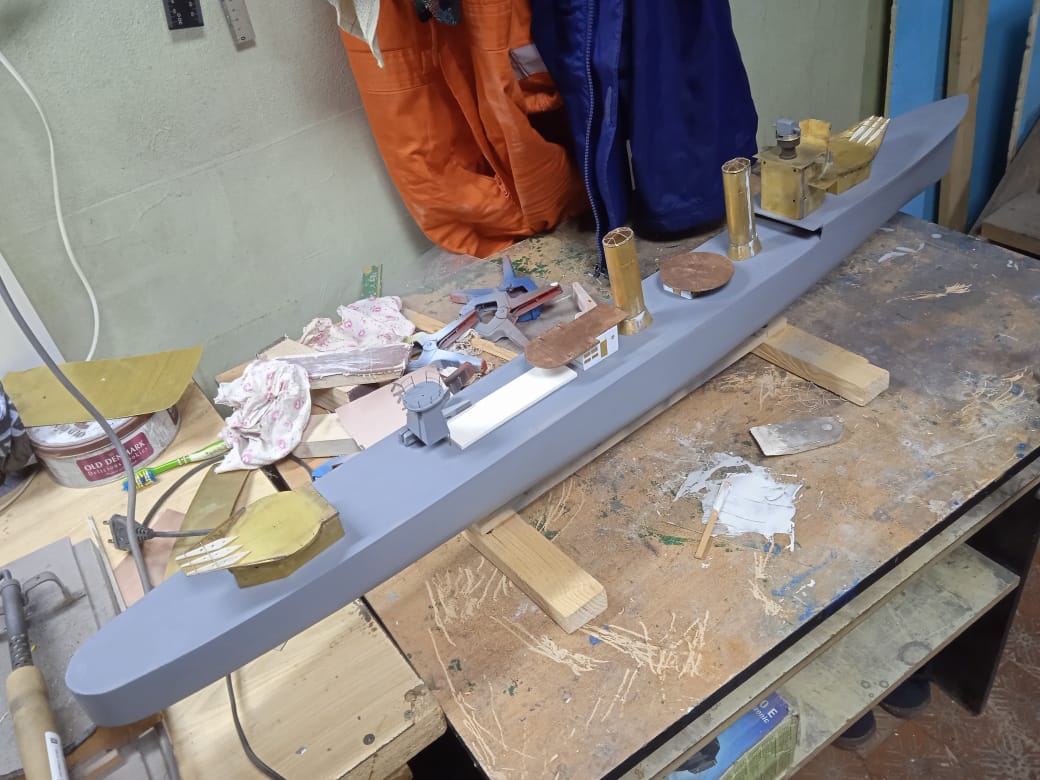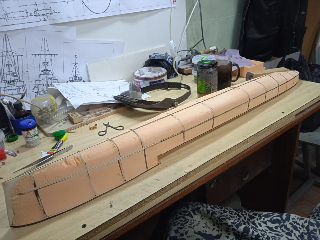 Лёша, до палубы ещё не дошел! Вот снял корку (снялась отлично, без повреждений!), вклеял на эпоксидке в неё досочку для крепления подмодельных ножек , форштевень и боковые кили и прошпаклевал.https://upforme.ru/uploads/0013/94/06/13/t715338.jpg