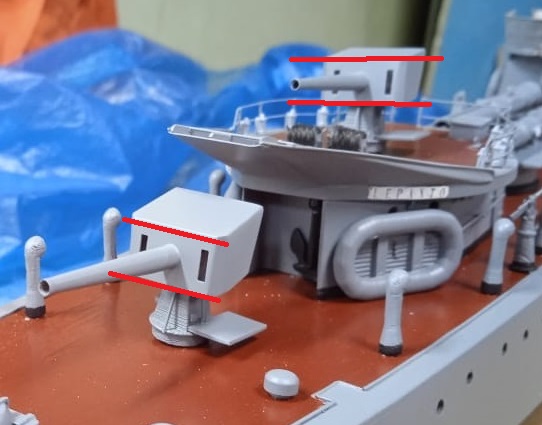 Ага, понял ! Проверю, но сдаётся мне, что это такой эффект на фото получился, в "живую" такого нет... да и щиты там хитрые, с наклоном. Но обязательно завтра гляну! И кстати, на этой фотке, и носовая и кормовая пушки ещё не вклеены, а вставлены на штифтах, это и дало "перекос"!