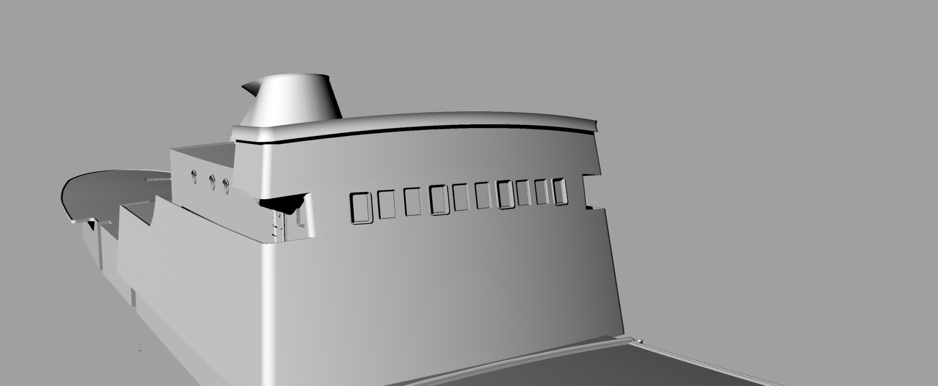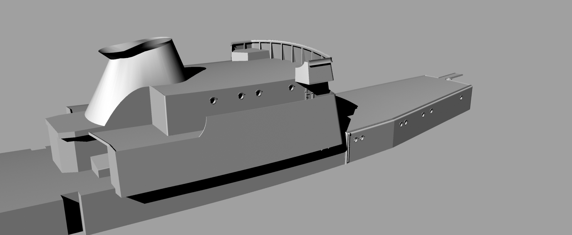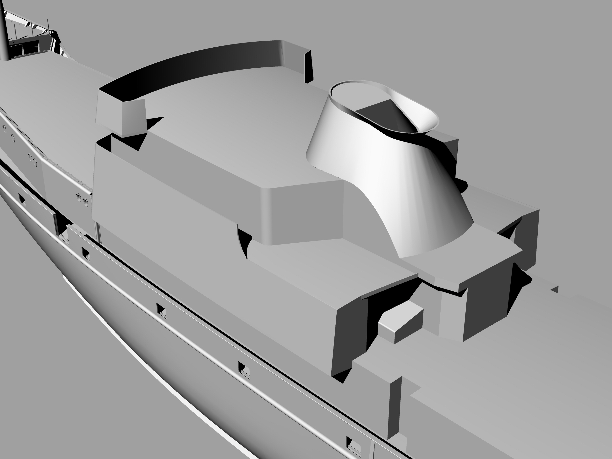 На сегодня расставлены все шпангоуты, сделаны вырезы под ватервейсы, идет насыщение деталировкой, чтобы при печати по секциям сразу оформлялись места под судовые устройства: