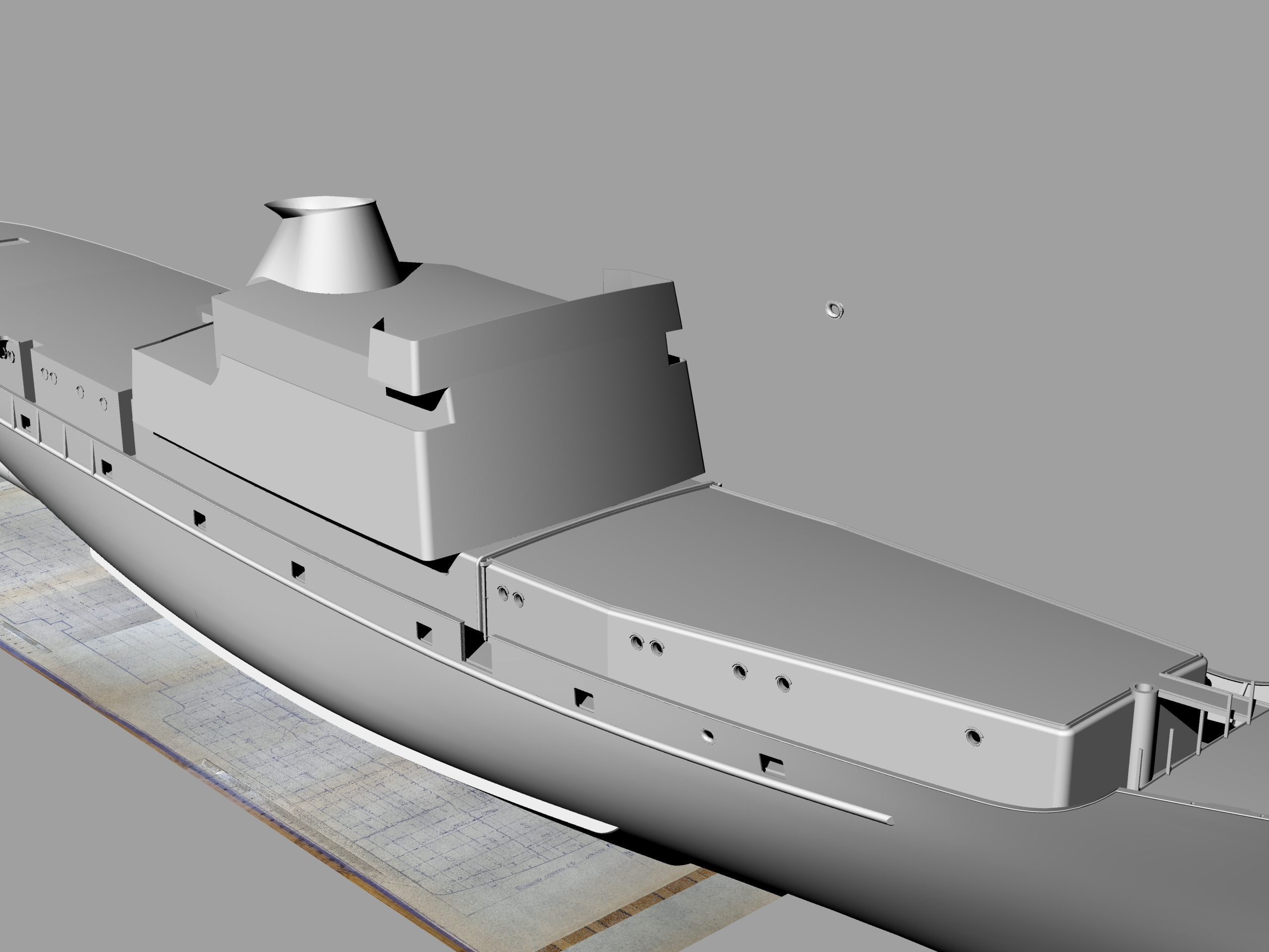 Корку из стеклоткани, выклеенную некоторое время назад, запорол прошкурив носовую оконечность до дыры, и восстанавливать ни возможности, ни желания уже нет. К сожалению, с рабочим местом для моделирования по-прежнему туго и развернуться негде, поэтому единственная возможность - это компьютер и 3D моделирование.